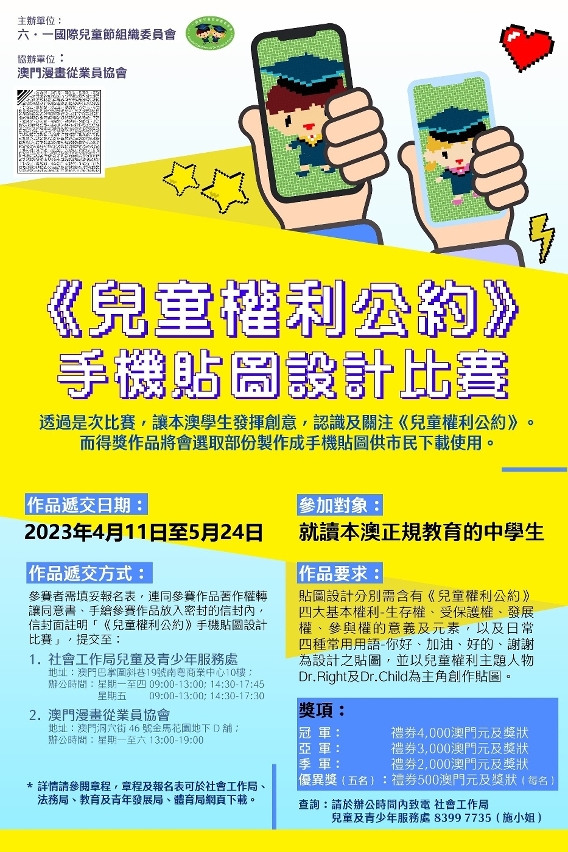 由“六.一國際兒童節組織委員會”(社會工作局、法務局、教育及青年發展局、體育局組成)主辦,澳門漫畫從業員協會協辦的「《兒童權利公約》手機貼圖設計比賽」,原定收件日期由2023年4月11日至28日,現延長至5月24日,讓參加者有更多時間創作及準備作品,從而增進對《兒童權利公約》的認識 。