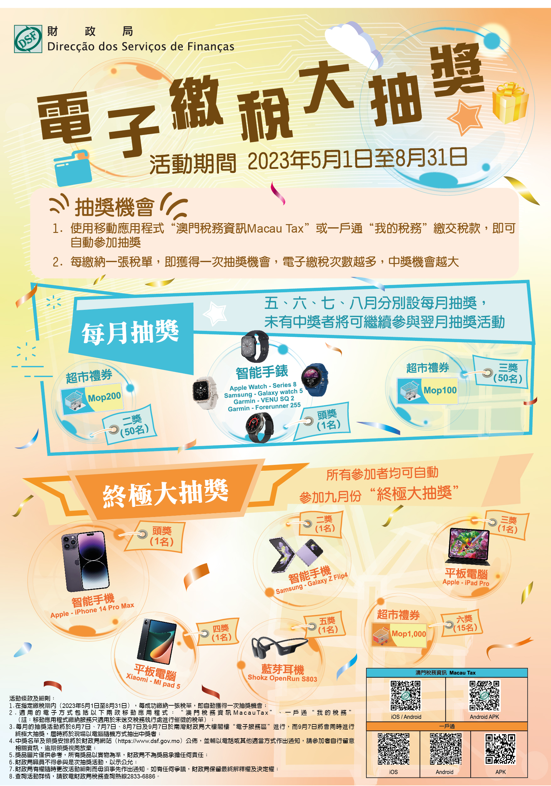每月的抽奬活動將於6月7日、7月7日、8月7日及9月7日於南灣財政局大樓閣樓“電子服務區”進行,而9月7日將會同時進行終極大抽奬。屆時會以電腦隨機方式抽出中獎者,中奬名單及領奬安排將於財政局網站(https://www.dsf.gov.mo)公佈,並輔以手機短訊或其他適當方式作出通知。