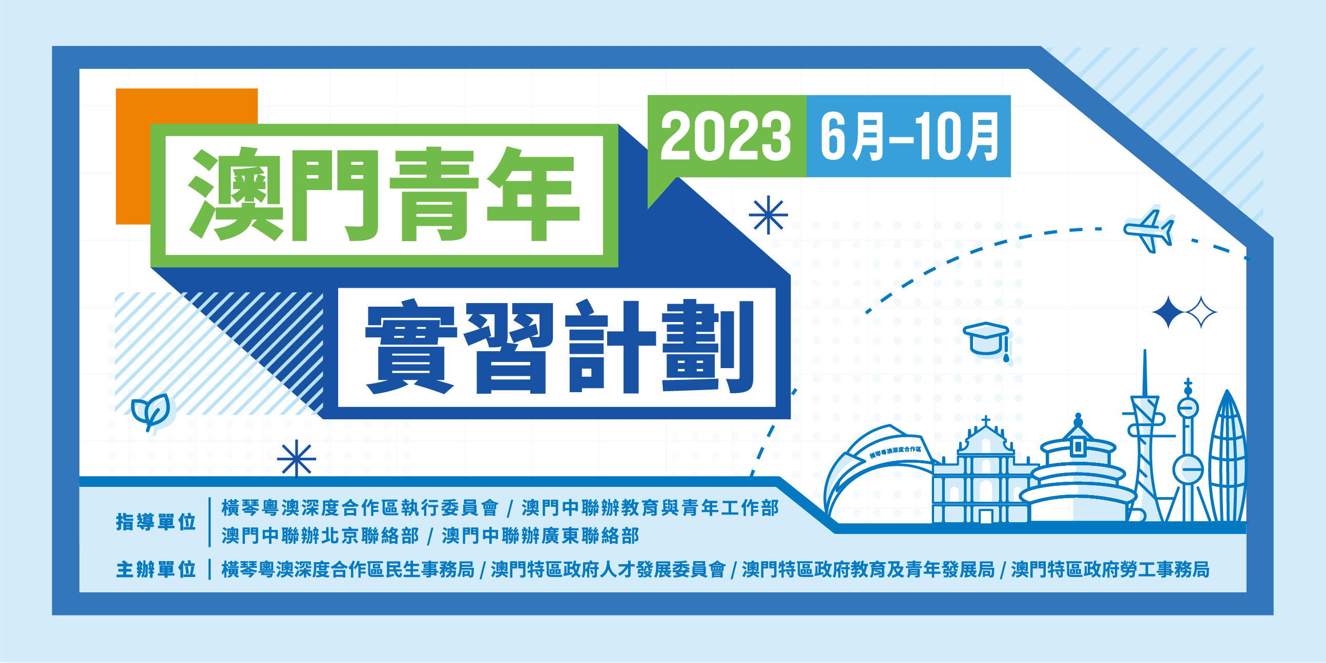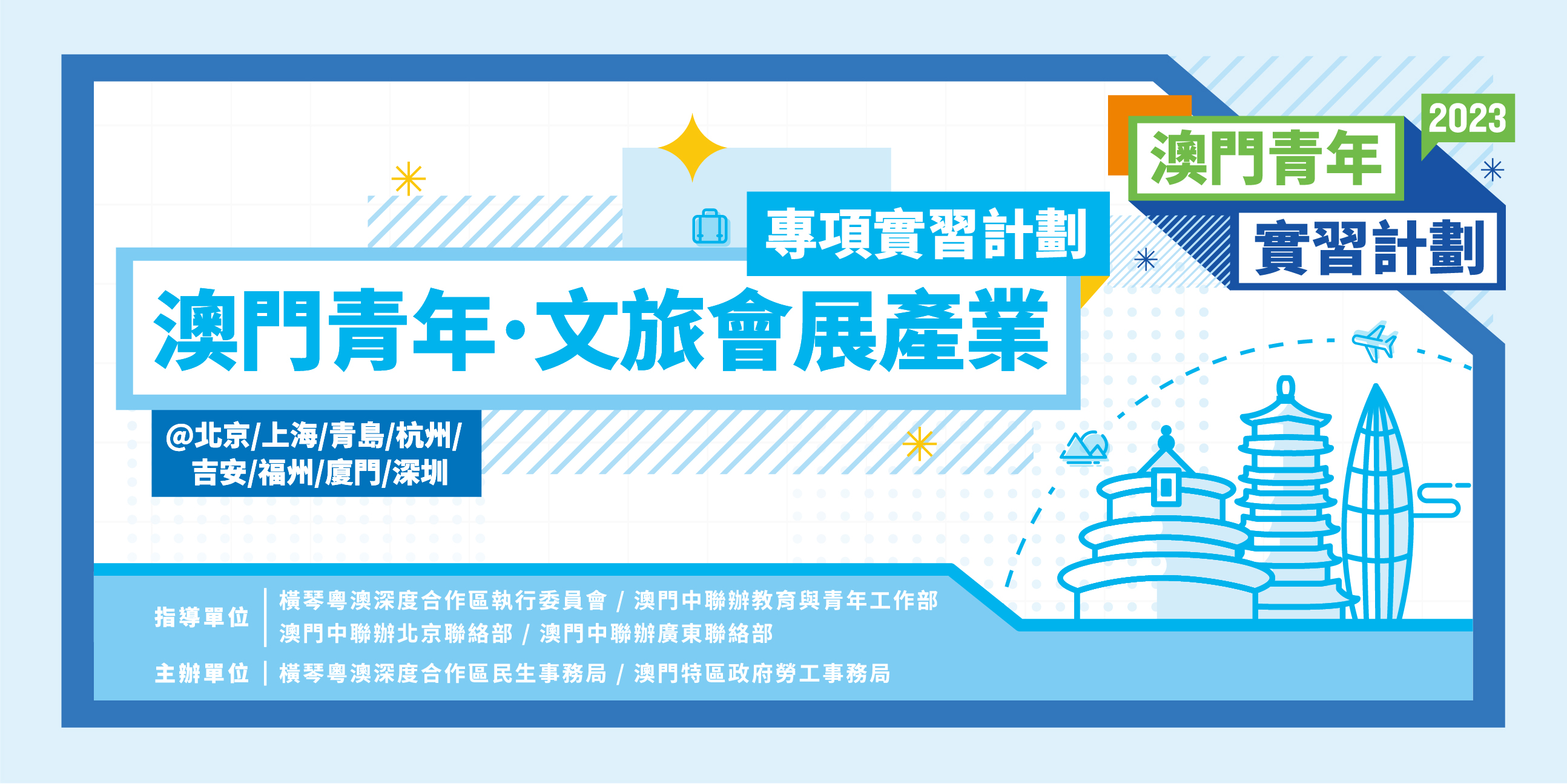 “澳門青年‧文旅會展產業專項實習計劃”是由勞工局與橫琴民生局及中青旅聯科(北京)數字營銷有限公司合作舉辦,中青旅聯科是內地領先的整合營銷和文旅運營專業機構,亦是內地最大的數字營銷公司之一,服務內地各級政府機構和世界500强企業,深耕文旅、消費、健康、科技及金融等行業,提供數字營銷、活動營銷及文旅運營等全方位服務,連續十年躋身中國公關公司TOP30。該項計劃的實習期為8周,提供30個實習崗位,涉及文旅運營、會展管理、平面設計及3D設計4個範疇,實習地點散佈於北京市、上海市、杭州市、青島市、吉安市、福州市、廈門市及深圳市。