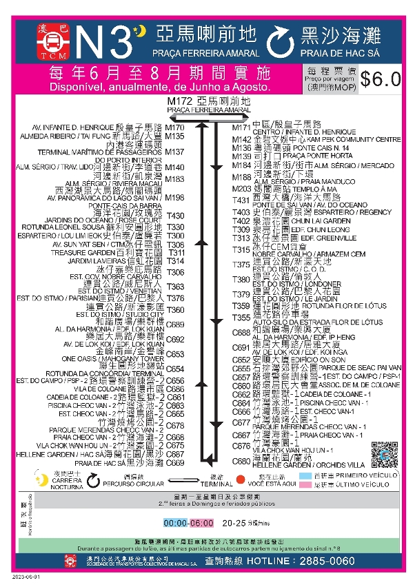 暑期將至,N3路線由2023年6月1日至8月31日期間,延長服務行程至黑沙海灘。詳情可查閱澳巴網頁 http://www.tcm.com.mo/web/NewsVB/data/997_cn.pdf。