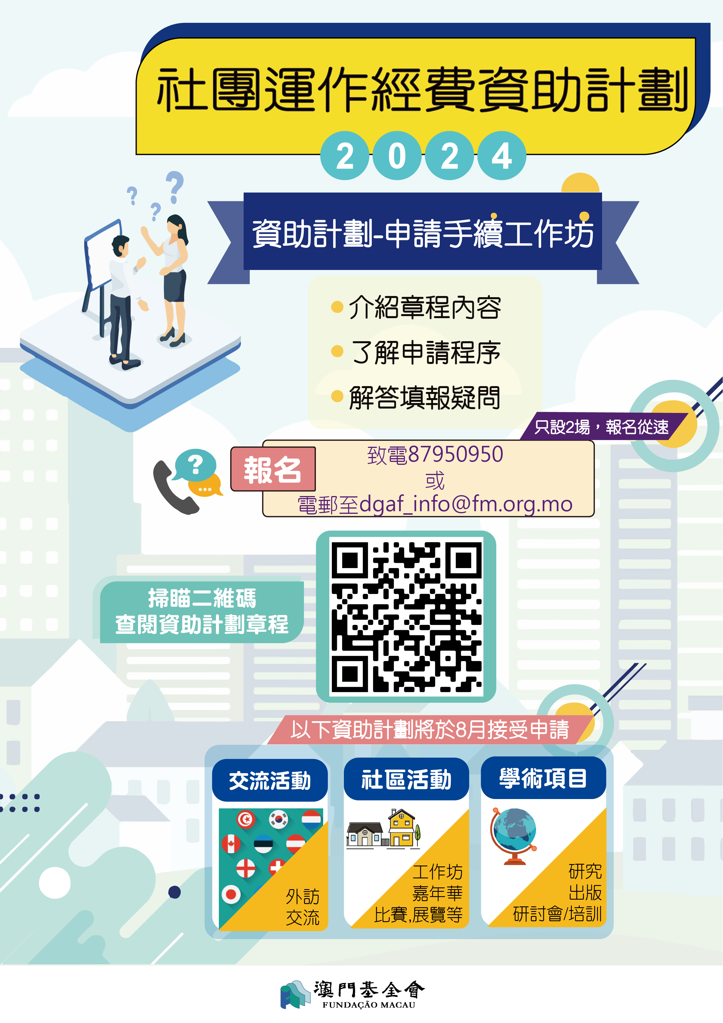 為支持社團做好活動策劃,進一步了解申請程序,澳基會將於6月8日及9日下午4時在澳門新馬路永光廣場7樓舉行“資助計劃-申請手續工作坊”,讓有意申請者進一步了解申請程序,有意參加者可發送電郵至 dgaf_info@fm.org.mo 或於辦公時間致電87950950報名留座。