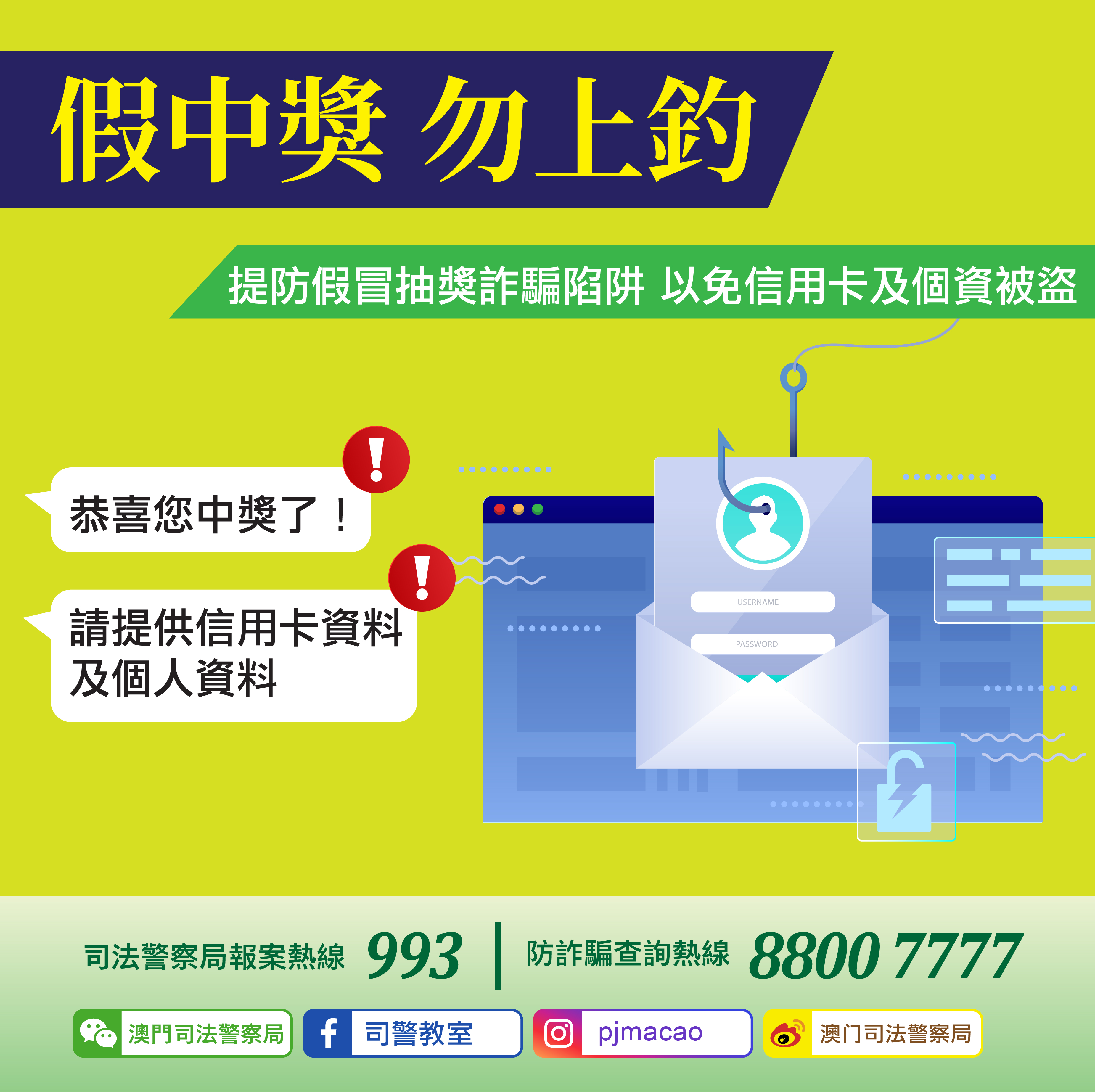 鑒於過往本澳曾發生有市民的網絡社交平台或通訊軟件帳戶被不明人士入侵,並向通訊錄上的親友發送訊息,以參與抽獎活動為名騙取個人及信用卡資料,本局再次呼籲市民,當有人透過網絡索取個人資料、銀行或信用卡資料,以及驗證碼時,必須提高警覺,即時致電對方以核實事件真偽,切勿透過網絡向無法證實身份的人士提供任何資料,以免蒙受損失。