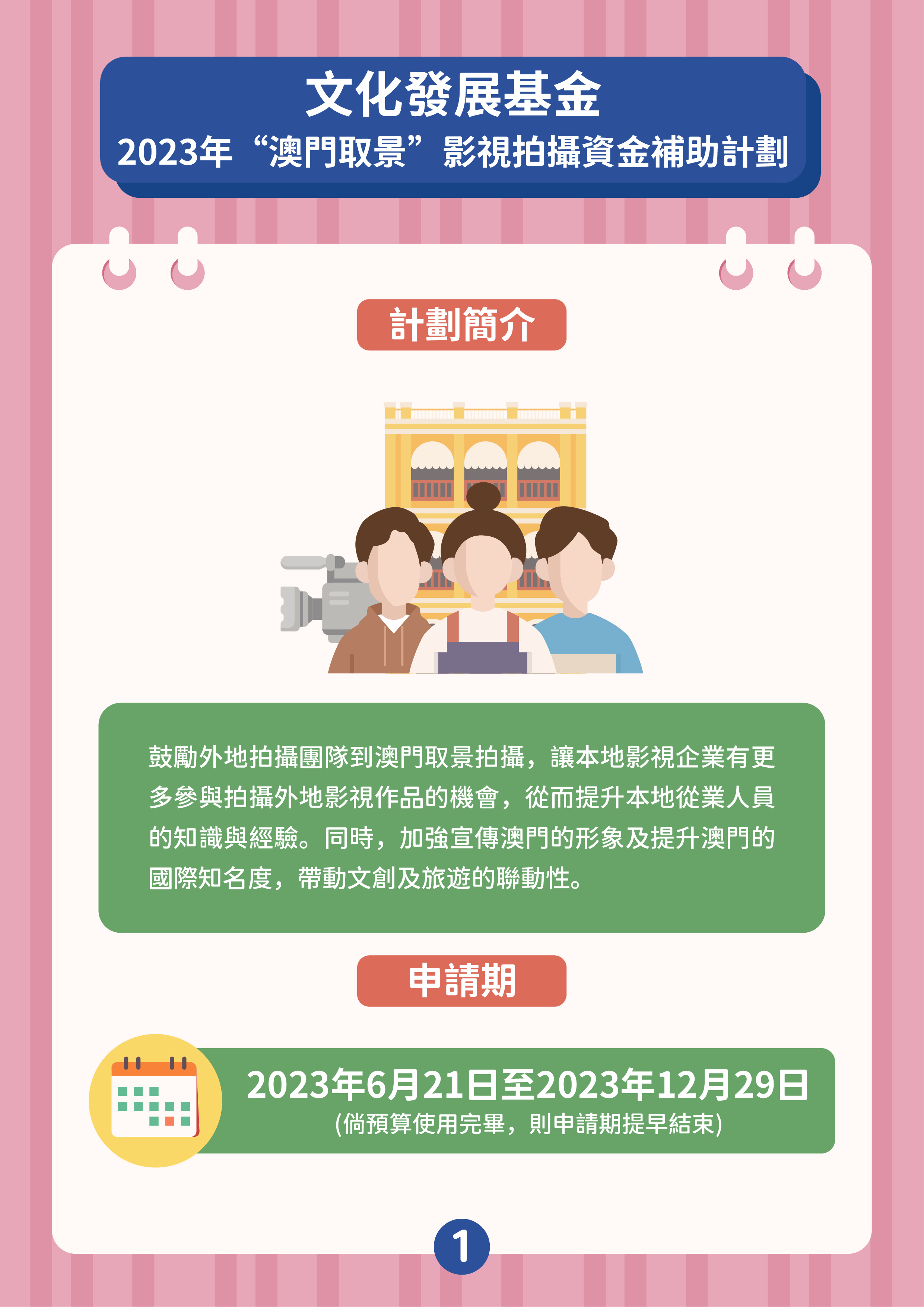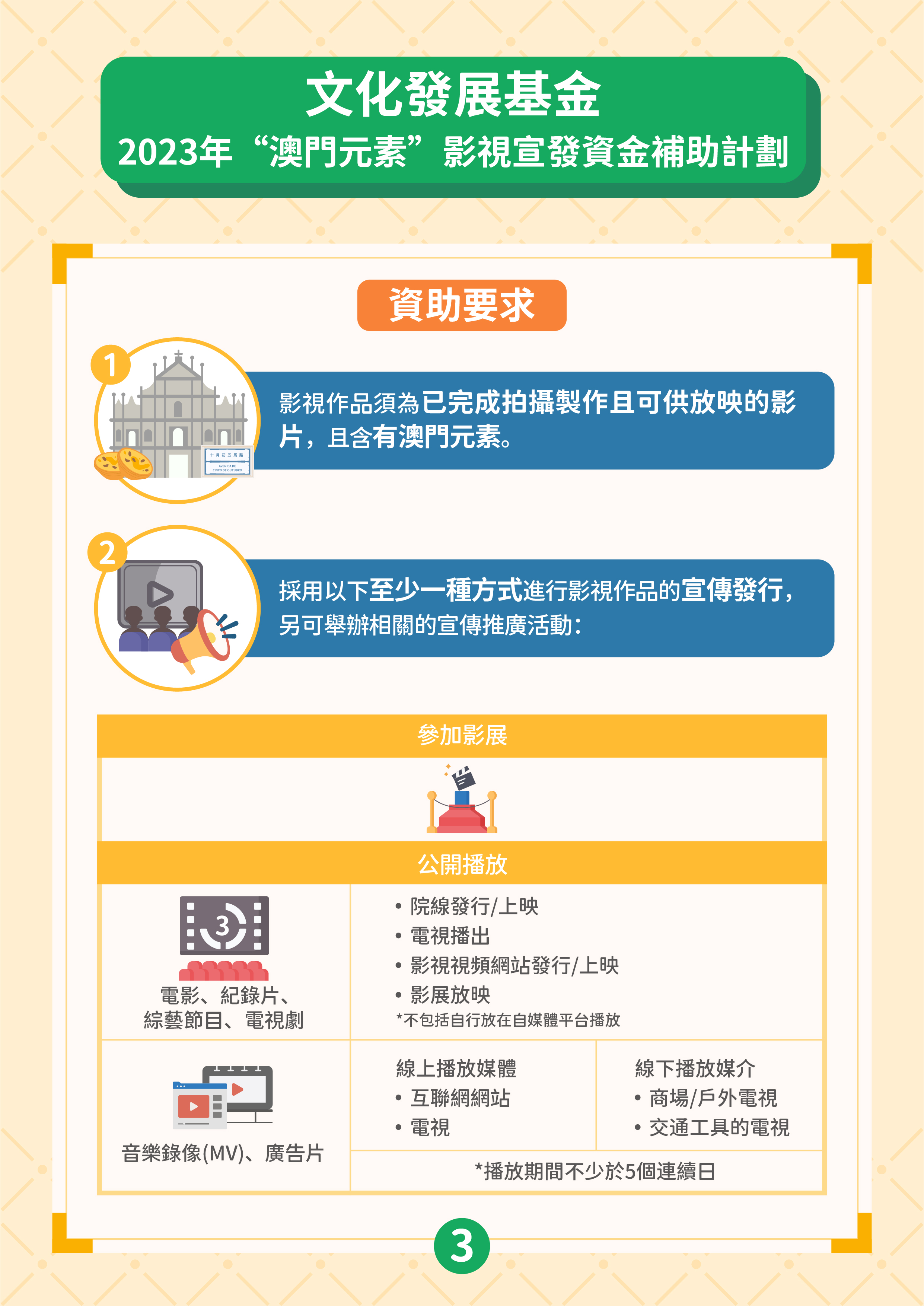 文化發展基金推出“澳門元素”影視宣發資金補助計劃、“澳門取景"影視拍攝資金補助計劃,支持具澳門元素影視作品投入市場,加強宣傳澳門城市形象及提升國際知名度,帶動文創及旅遊的聯動性,推動澳門影視產業發展。
