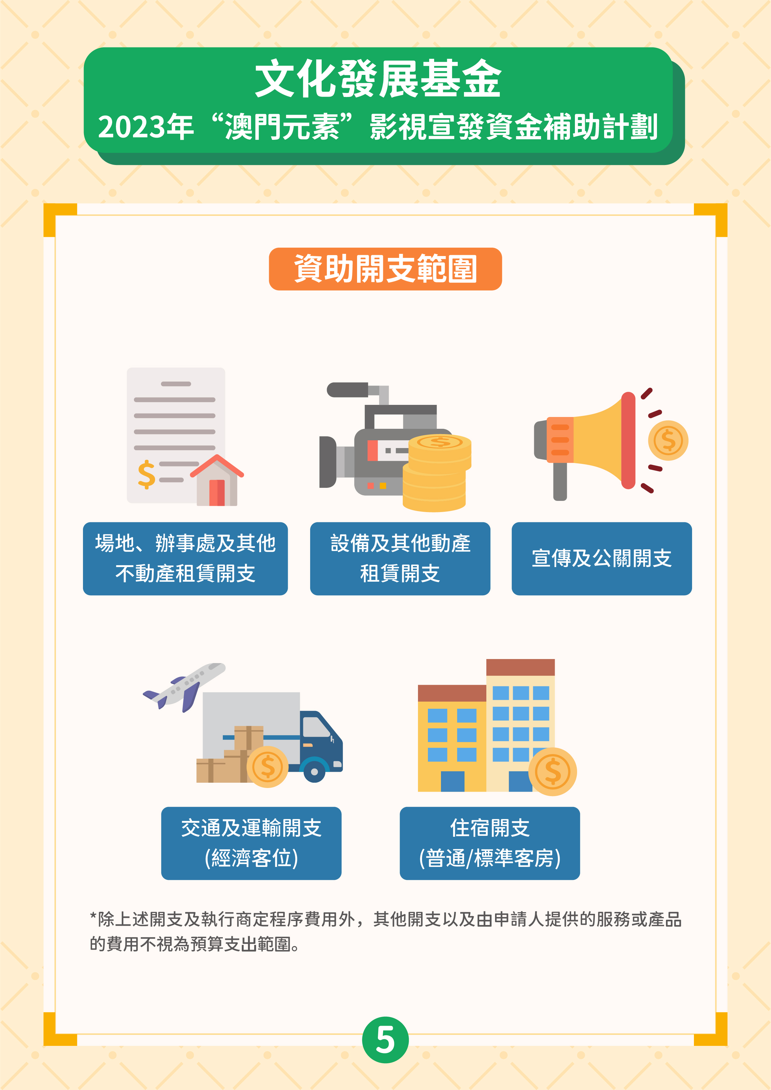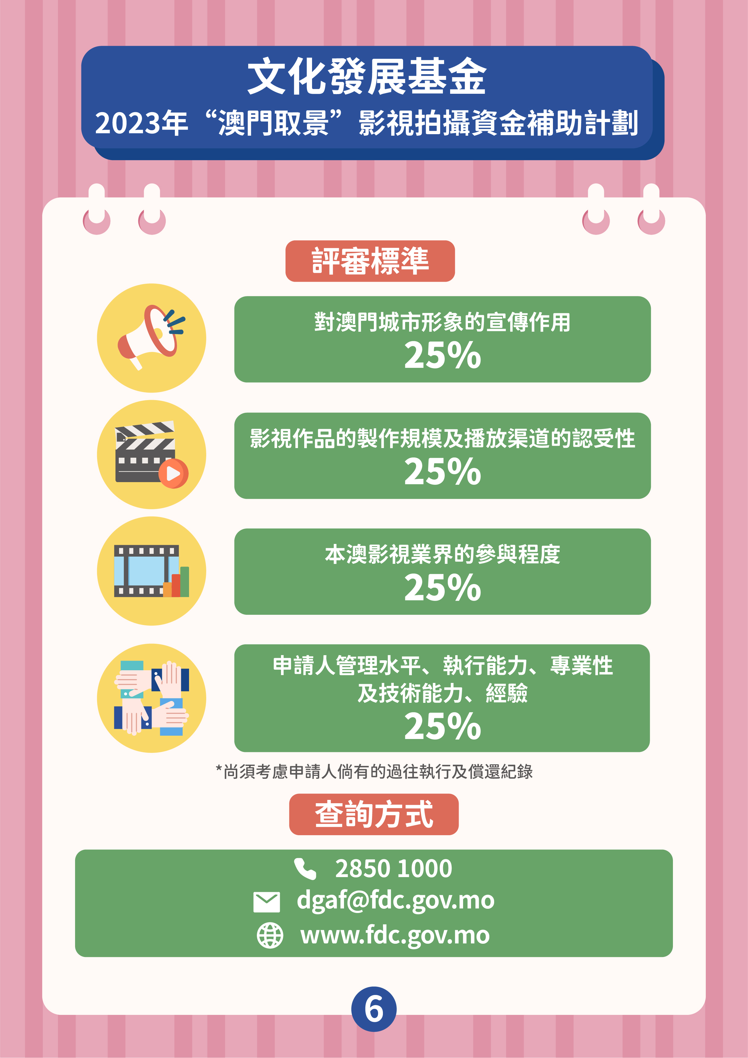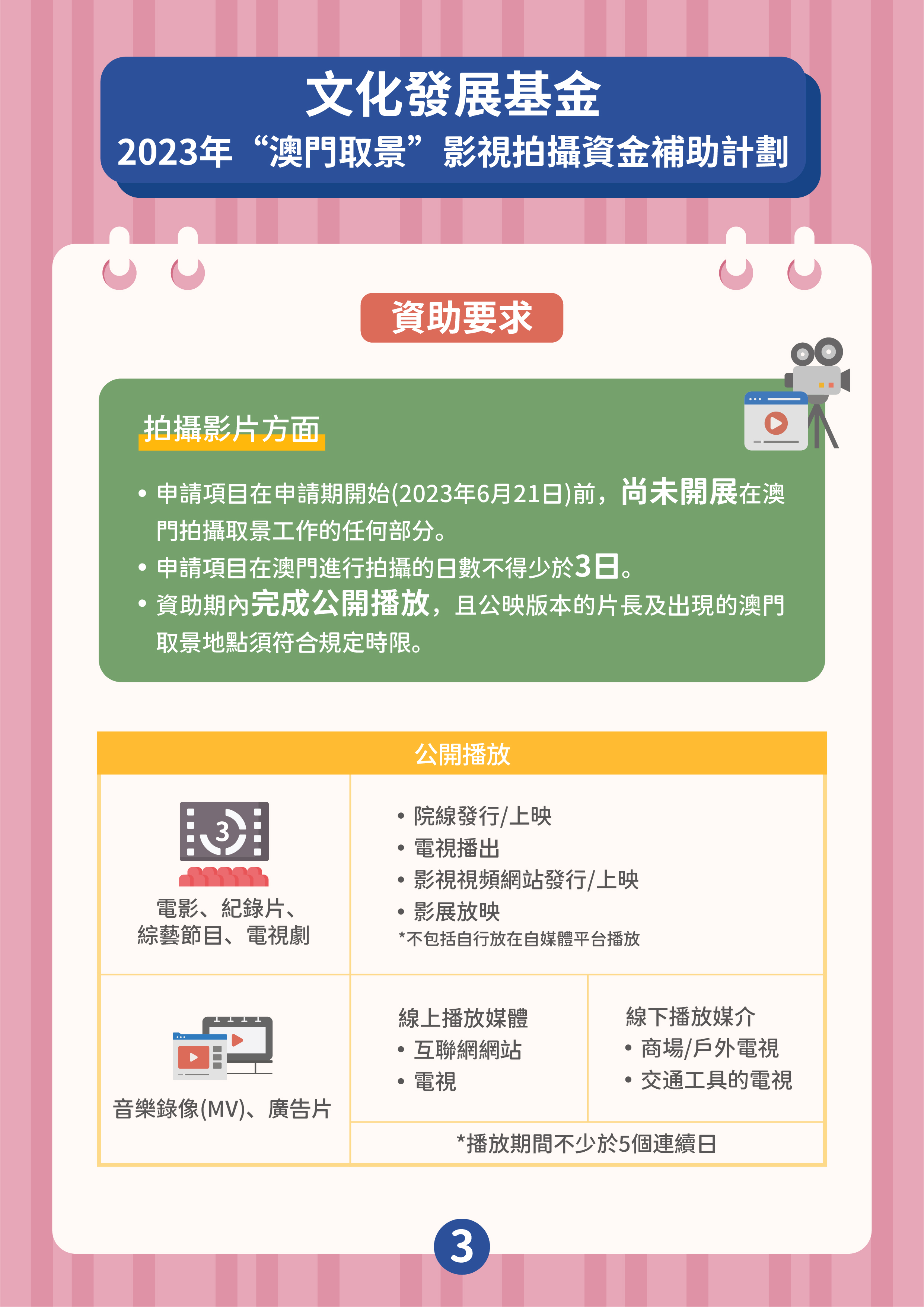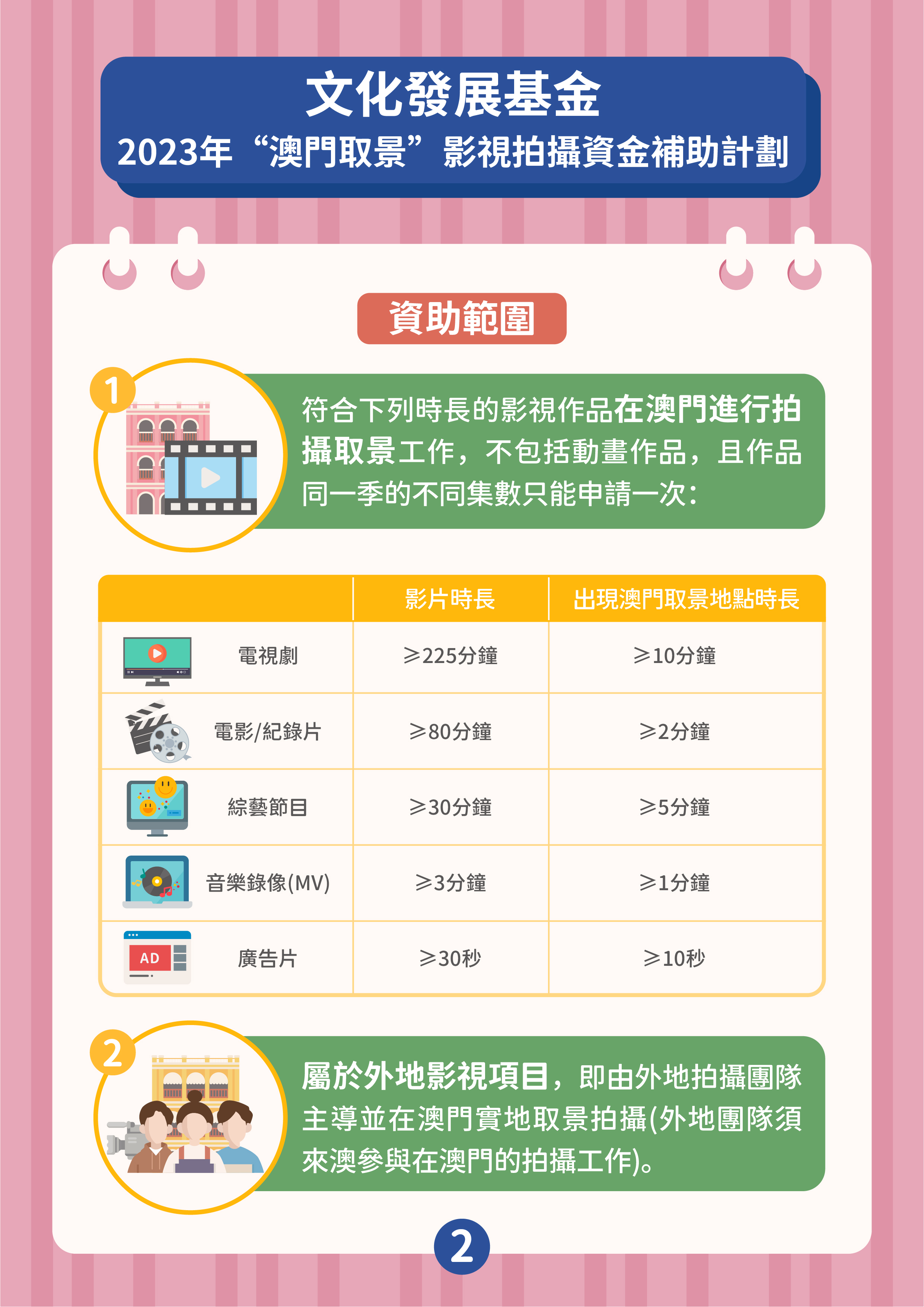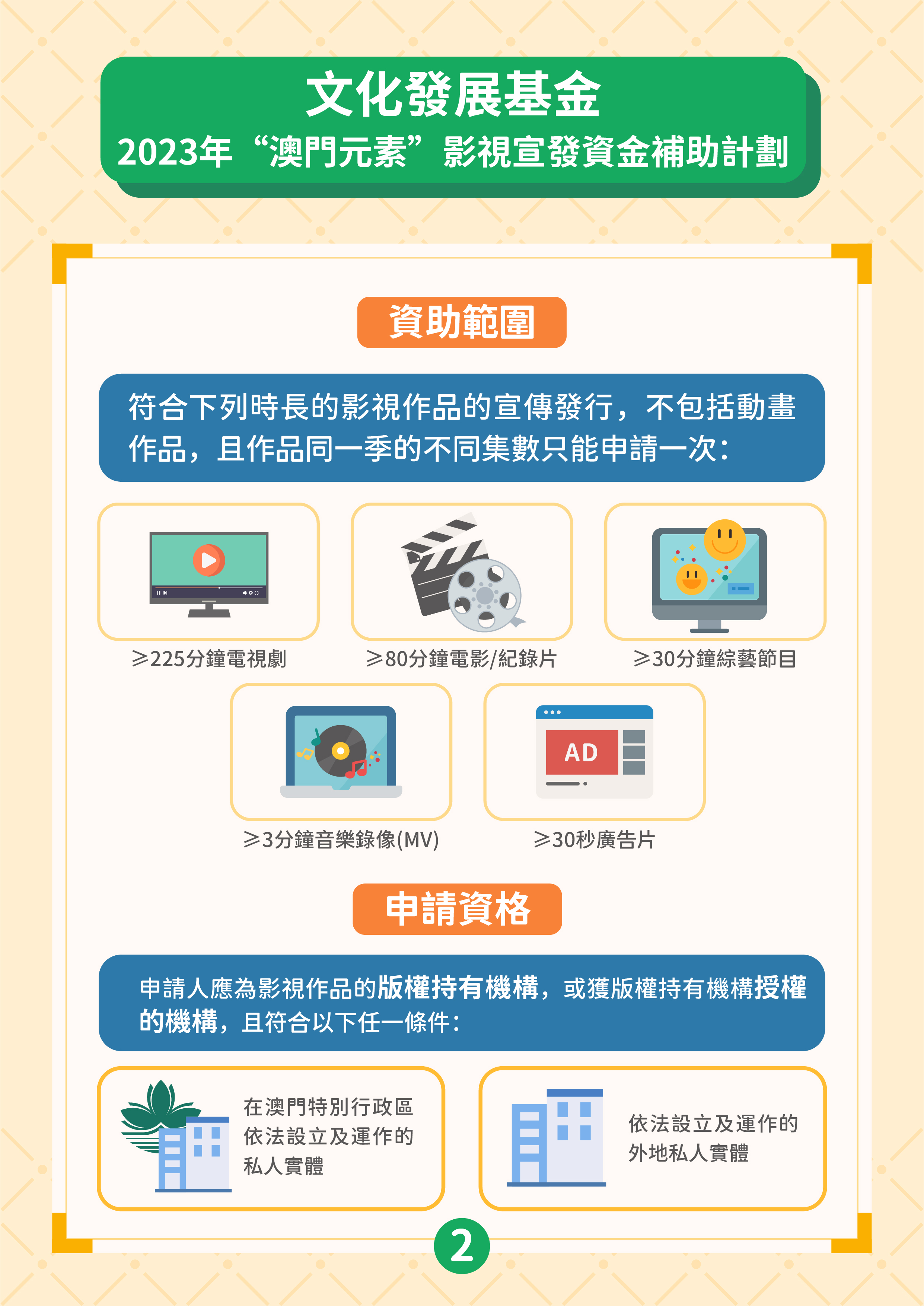 兩項資助計劃由6月21日開始接受申請,最後接受申請限期為2023年12月29日,資助名額不限,直至相關資助計劃預算使用完畢為止,屆時申請期將同時提早結束,基金將在網站對外公佈有關訊息。兩項計劃的獲資助作品類型包括電視劇、電影、紀錄片、綜藝節目、音樂錄像及廣告片,但不包括動畫作品。