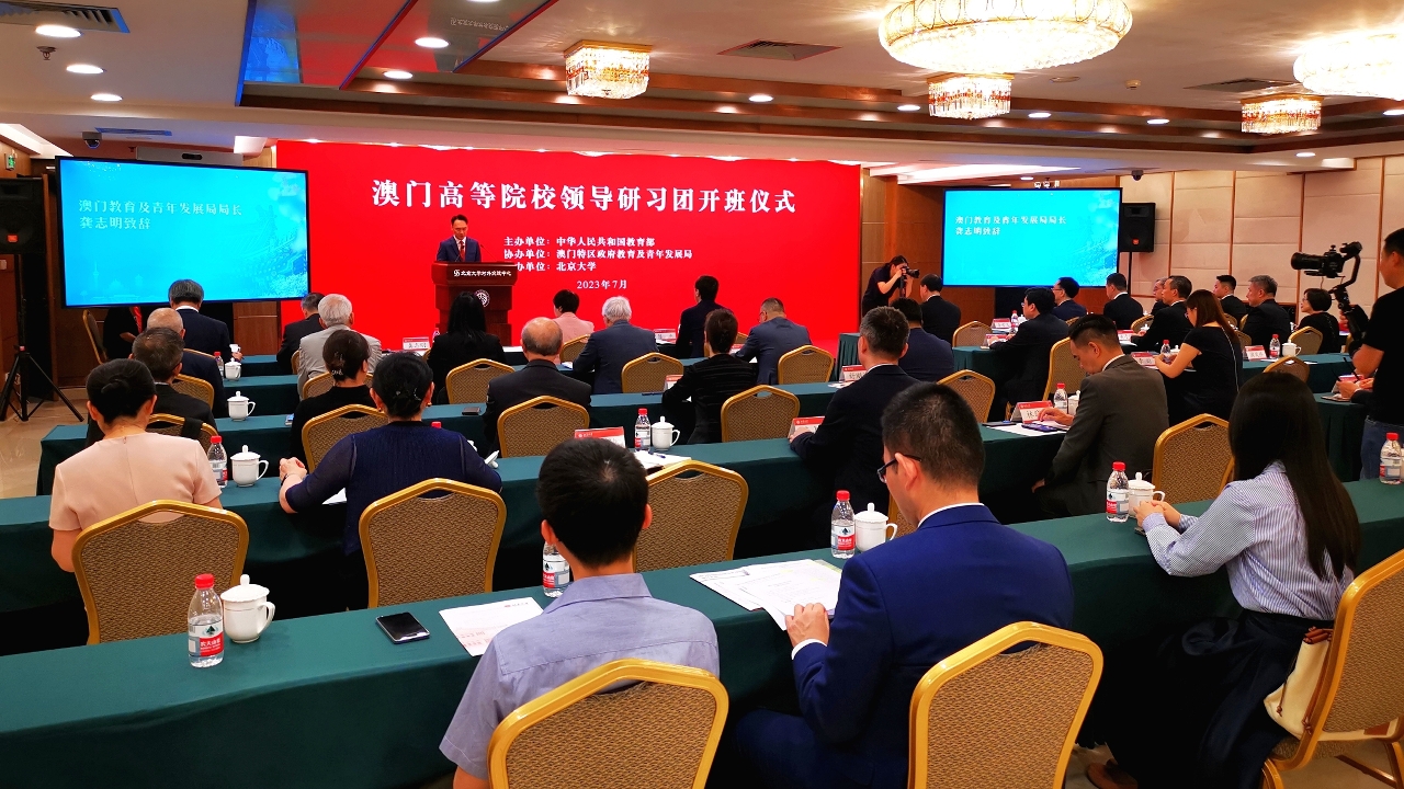 研習開班儀式於今天(17日)上午假北京大學英傑交流中心進行,由國家教育部副部長陳杰主持,北京大學校長龔旗煌、副校長王博,國家教育部國際合作與交流司司長劉錦、高等教育司副司長武世興、高校學生司二級巡視員苟人民、學位管理與研究生教育司二級巡視員唐繼衛、港澳台辦副主任舒剛波,中央人民政府駐澳門特別行政區聯絡辦公室教育與青年工作部部長李雪飛等參加。