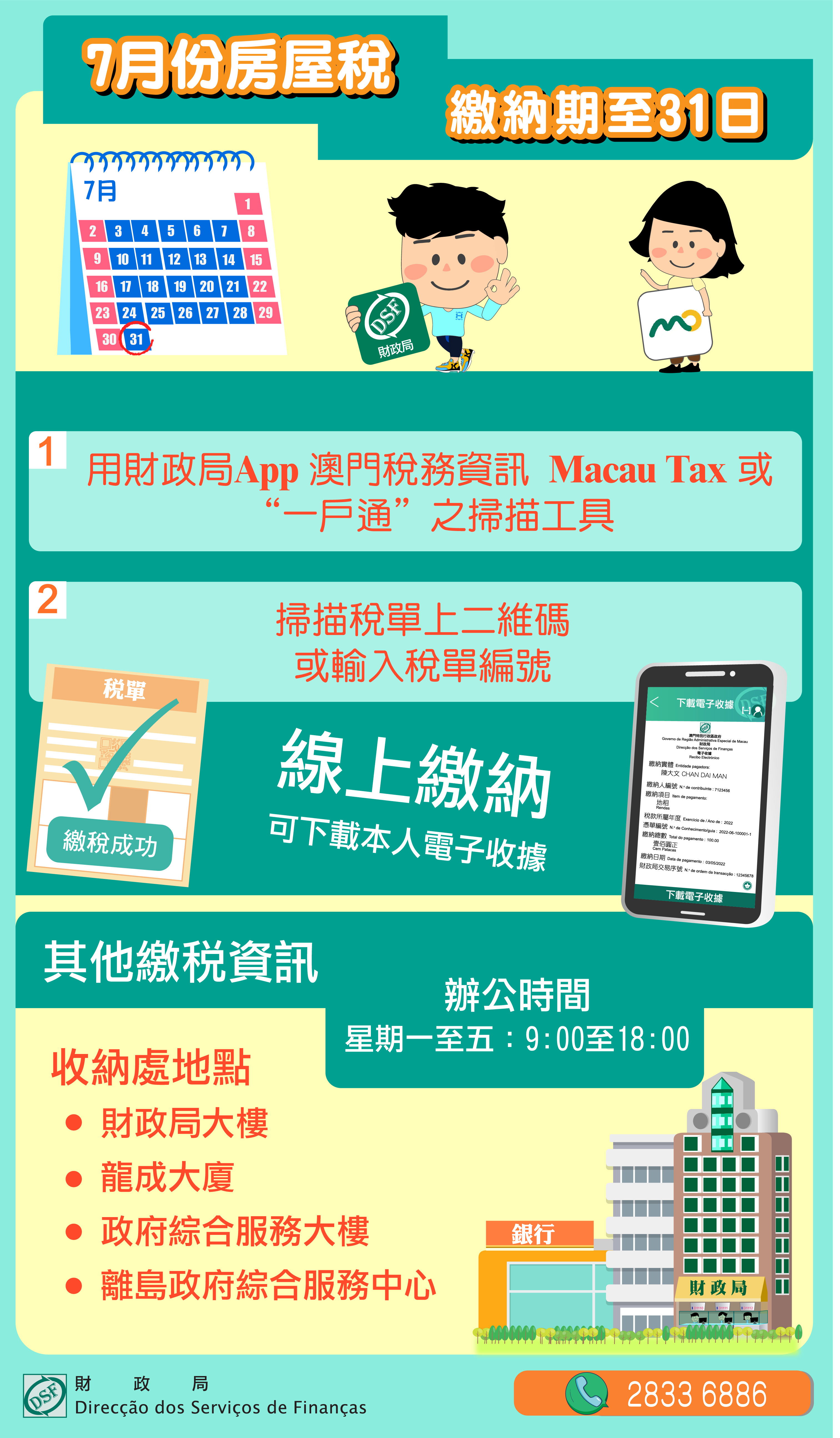 財政局提醒房屋稅納稅人,2022年度房屋稅徵稅憑單上繳納月份屬7月的房屋稅,繳納期限至7月31日屆滿。為免增加排隊輪候時間或因逾期繳納而須附加過期利息和罰款,仍未繳納之納稅人應儘快繳納。