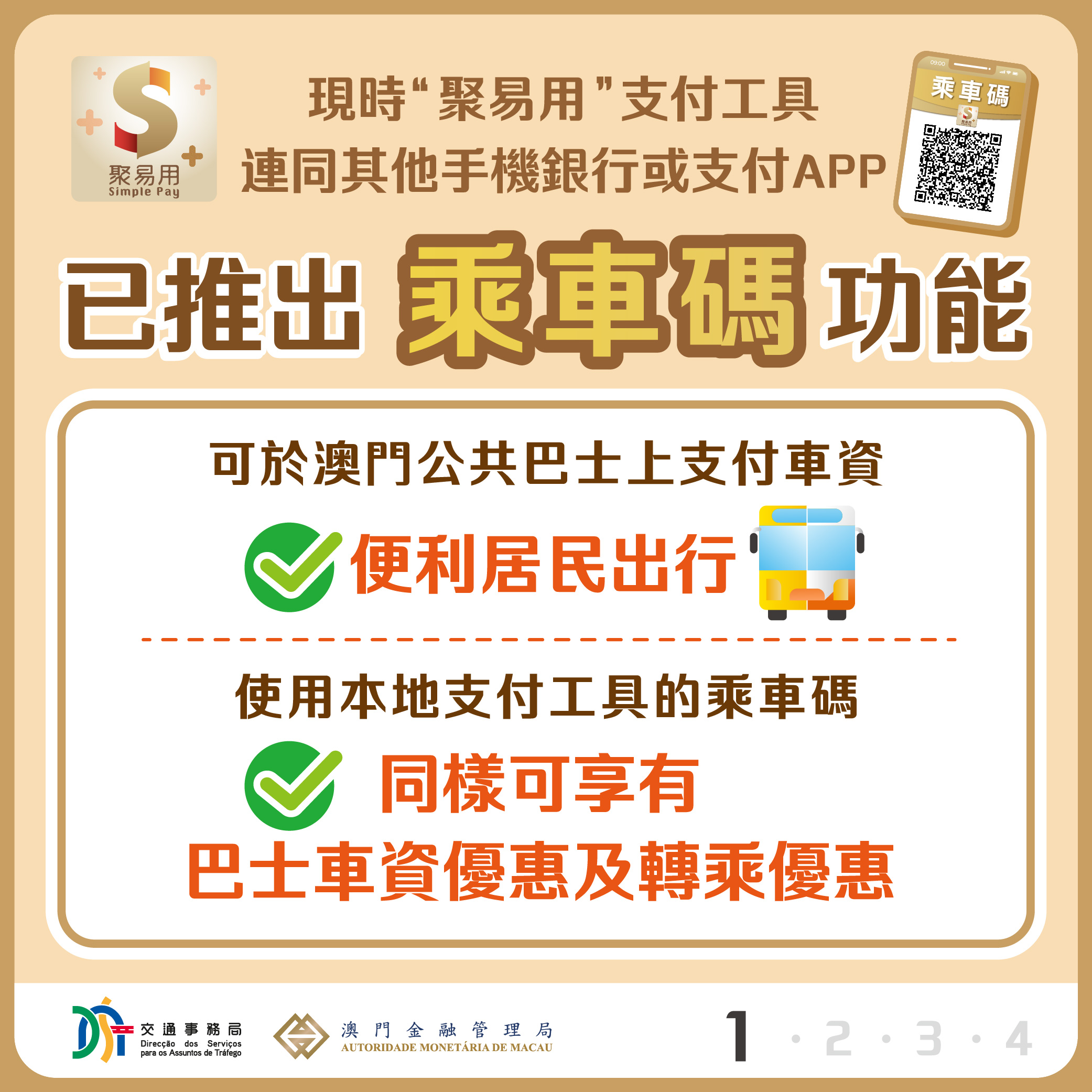 2021年首季,澳門金融管理局協調金融機構推出“聚易用”聚合支付服務,便利居民日常消費。為促進移動支付創新及回應社會訴求,交通事務局與澳門金融管理局攜手合作,分別推動巴士公司配合,以及協調多家金融機構,完成系統改造,並於支付工具APP內新增“乘車碼”功能,將“聚易用”支付體驗延伸至公共巴士場景,並命名為“聚易用+”(“Simple Pay+”)。“聚易用+”標識將陸續顯示於支付工具APP內及張貼於巴士收費機當眼位置。