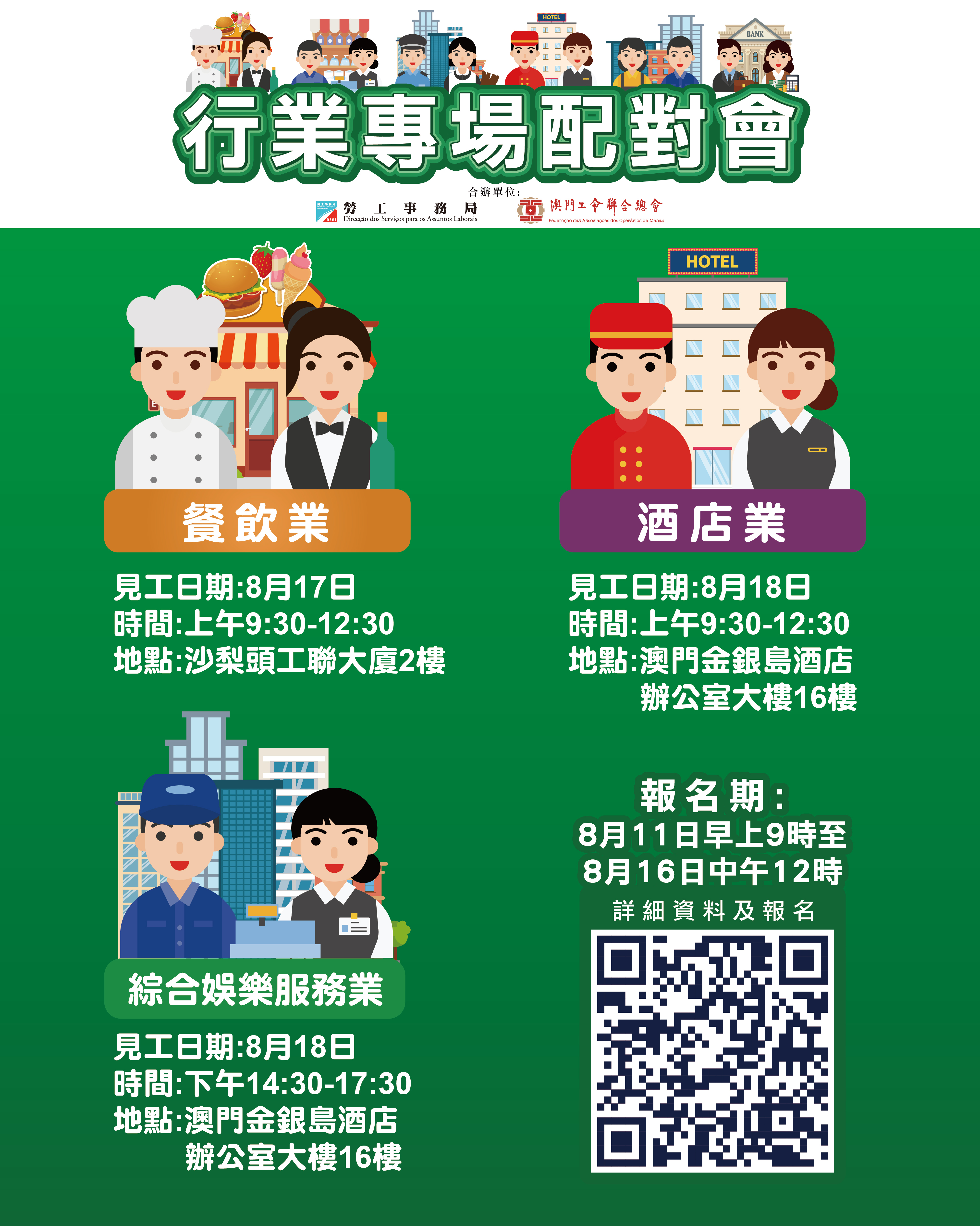 8月17日上午餐飲業配對會在澳門工會聯合總會二樓(沙梨頭海邊街2-6號工聯大廈)舉行;8月18日上午酒店業配對會及下午綜合娛樂服務業配對會均在澳門金銀島酒店辦公室大樓16樓舉行,報名日期為8月11日上午9時至8月16日中午12時。