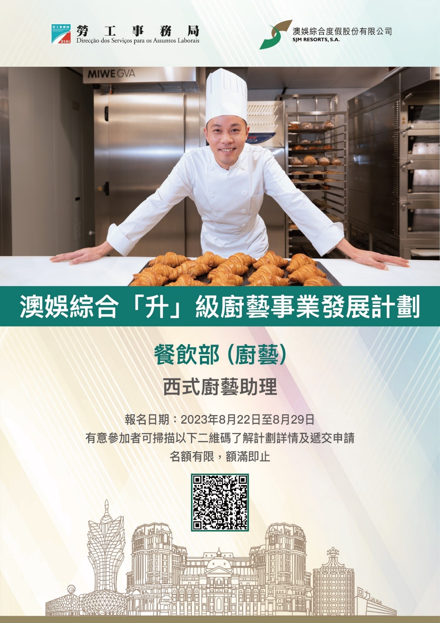 為進一步推動澳門作為“創意城巿美食之都”,培養本地餐飲廚藝人才,勞工事務局和澳娛綜合度假股份有限公司合作推出“澳娛綜合「升」級廚藝事業發展計劃",以“先入職、後培訓”方式,協助符合條件和有意從事餐飲廚藝事業發展的澳門居民就業,計劃由8月22日至29日接受申請。