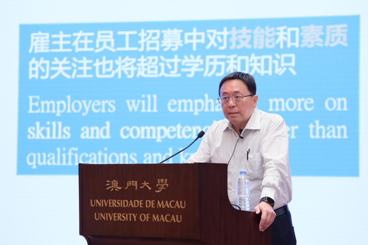 澳門大學今(21)日舉行新學年首場“大學講壇”,由香港科技大學(廣州)校長、香港科技大學計算機科學及工程系講座教授倪明選以“為未來培養人才:生成式人工智能對高等教育的影響”為題發表演說,探討在人工智能驅動的時代下高等教育的發展方向。講座吸引一眾澳大師生及公眾人士參與,氣氛熱烈。