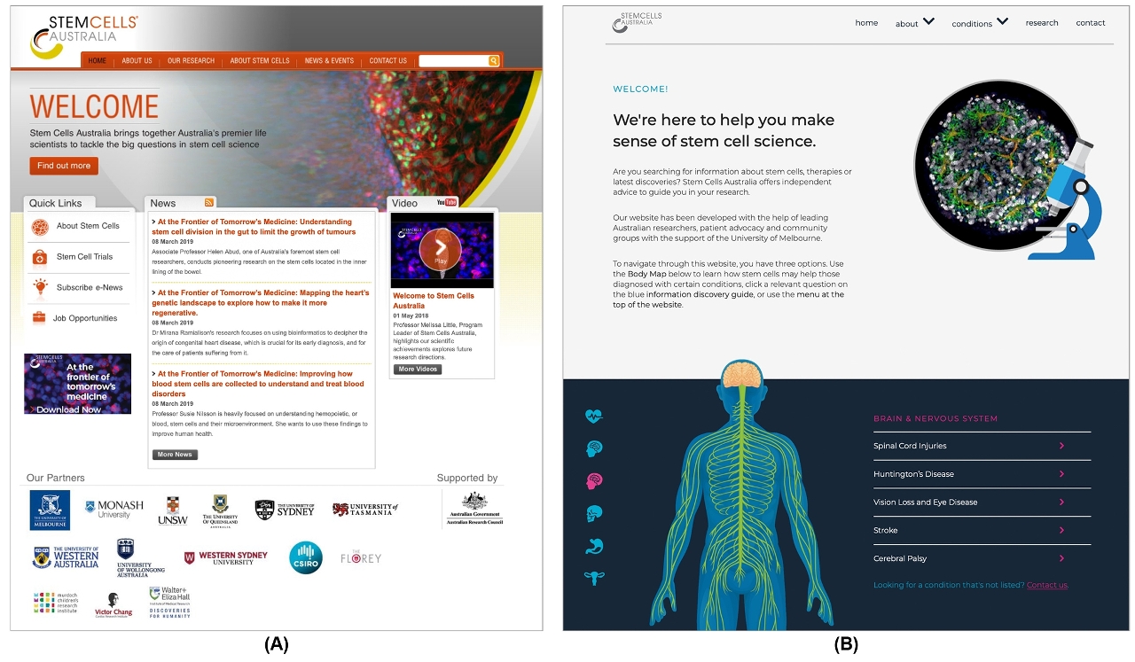 研究以澳洲幹細胞平台網站(STEM CELLS AUSTRALIA)的重建作為開發和評估傳遞複雜科學與健康訊息網站的案例研究。網站針對瀏覽者的知識差距和訊息需求以參與式設計進行重建,將複雜的知識、網站結構與公眾的訊息需求相結合,藉以提升網站的成效和讀者參與度及體驗感,從而為全球的讀者提供準確的訊息。經谷歌分析(Google Analytics) 對新版本網站的數據進行分析,能確定網站瀏覽者的健康訊息搜索模式,進而創建度身訂造的健康資訊。研究還為健康訊息和科學網站提供優化建議,有效地傳播複雜的健康知識。此研究冀可為本澳大健康產業的發展提供參考意見,助力促進本澳經濟適度多元化發展。