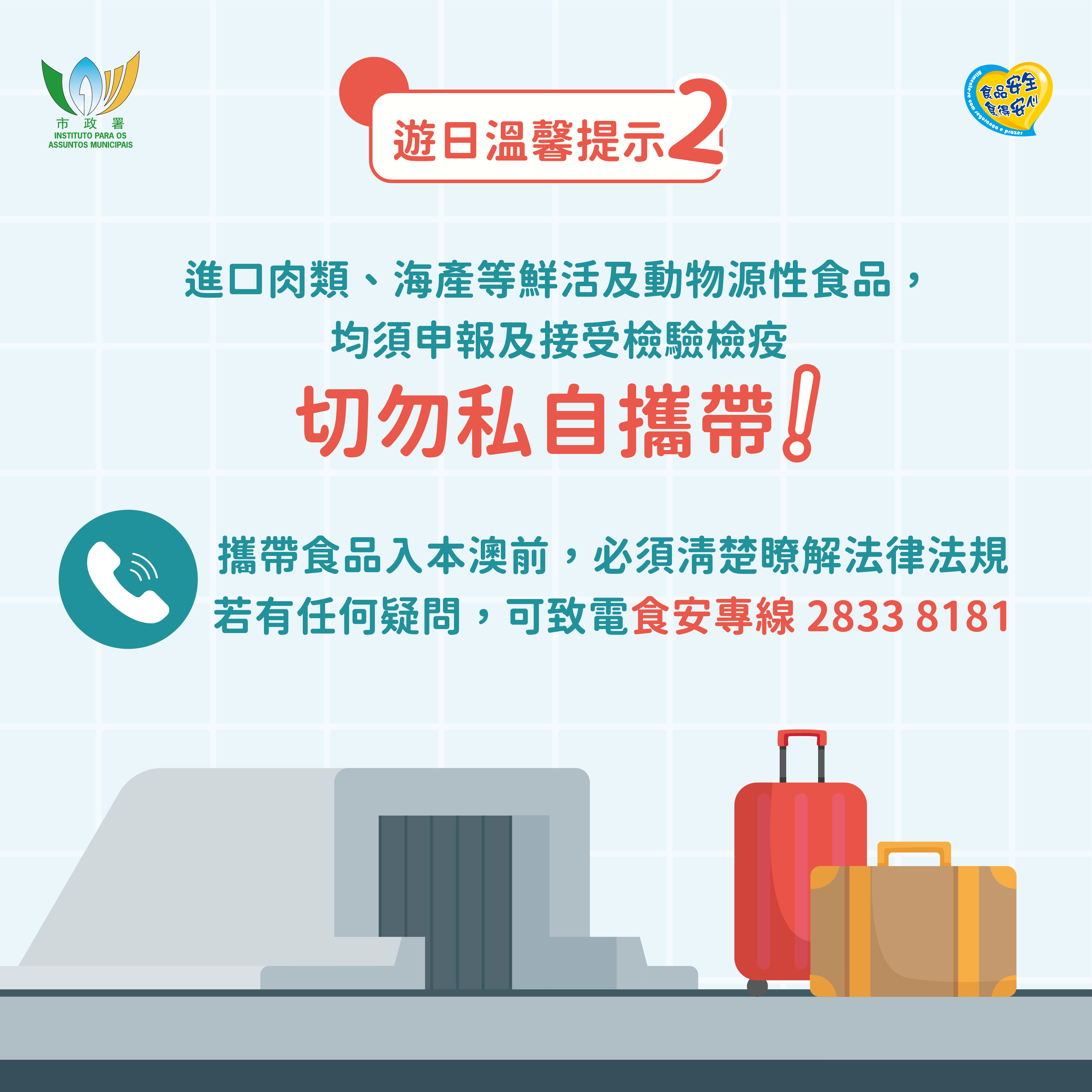 巿政署及澳門海關同時呼籲,前往日本旅遊的居民,注意切勿攜帶上述禁止進口的食品回澳。如有查詢或想了解更多相關資訊,可致電澳門海關熱線89894317或食安專線28338181。