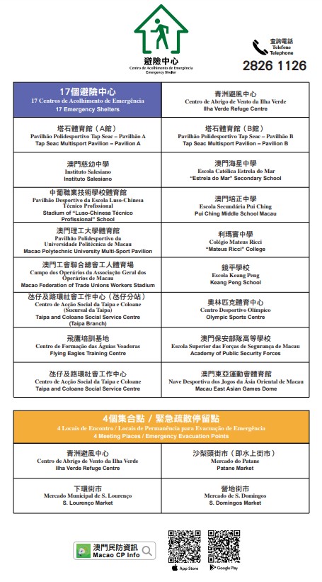 社會工作局正加緊向全澳避險中心運送物資,並確保避險中心的物資供應及輪值人員準備就緒。社會工作局開放避險中心的有關安排如下,請有需要市民,尤其低窪地區居民留意。