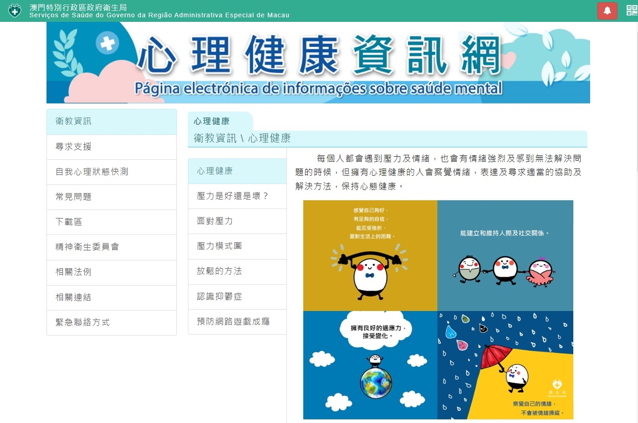 世界衛生組織和國際自殺防治學會於2003年起,把每年的9月10日訂為“世界預防自殺日”,並以“展現行動,創造希望” 作為2021-2023年世界預防自殺日的三年一度的活動主題,以激發公眾對精神健康的關注。為響應“世界預防自殺日”,消除公眾對精神疾病的誤解和偏見,加強對心理健康的瞭解,提高有需要人士主動尋求專業支援的意願,促進本澳居民整體的心理健康水平,衛生局明(10)日起推出“心理健康資訊網”(網址: https://www.ssm.gov.mo/apps1/mentalhealth/ch.aspx#clg28356 )中文版。另外,葡文版網頁正構建中並將於一個月內推出。網站內容包括:衛教資訊、自我心理狀態快速測試、社區支援服務資源等多個部份,並介紹抑鬱症的資訊和常見誤解、面對壓力的放鬆方法,以及不同級別服務(社區服務、社區精神健康專項服務、衛生中心心理保健服務和精神科專科服務)的簡介和聯絡方式等。