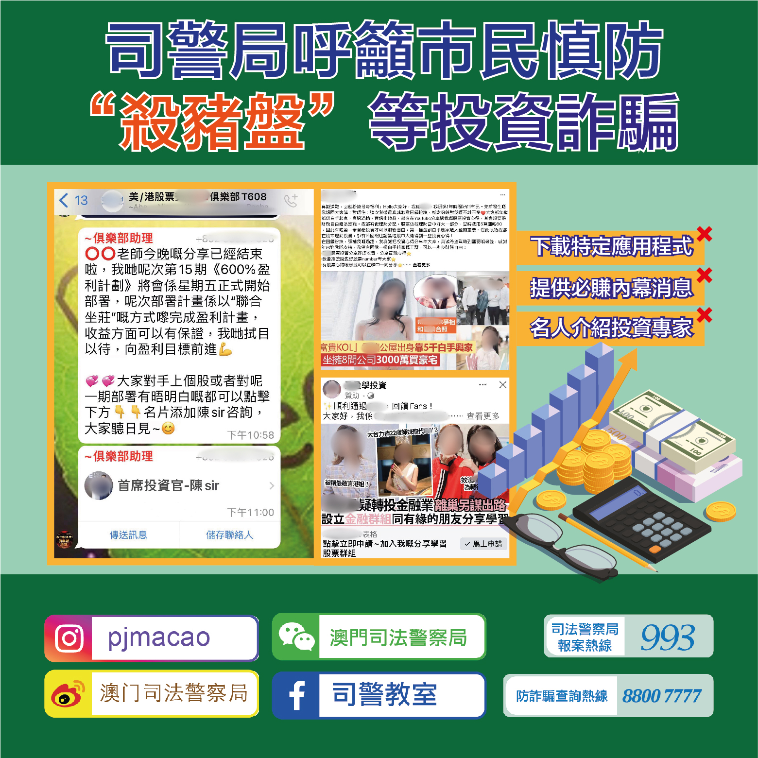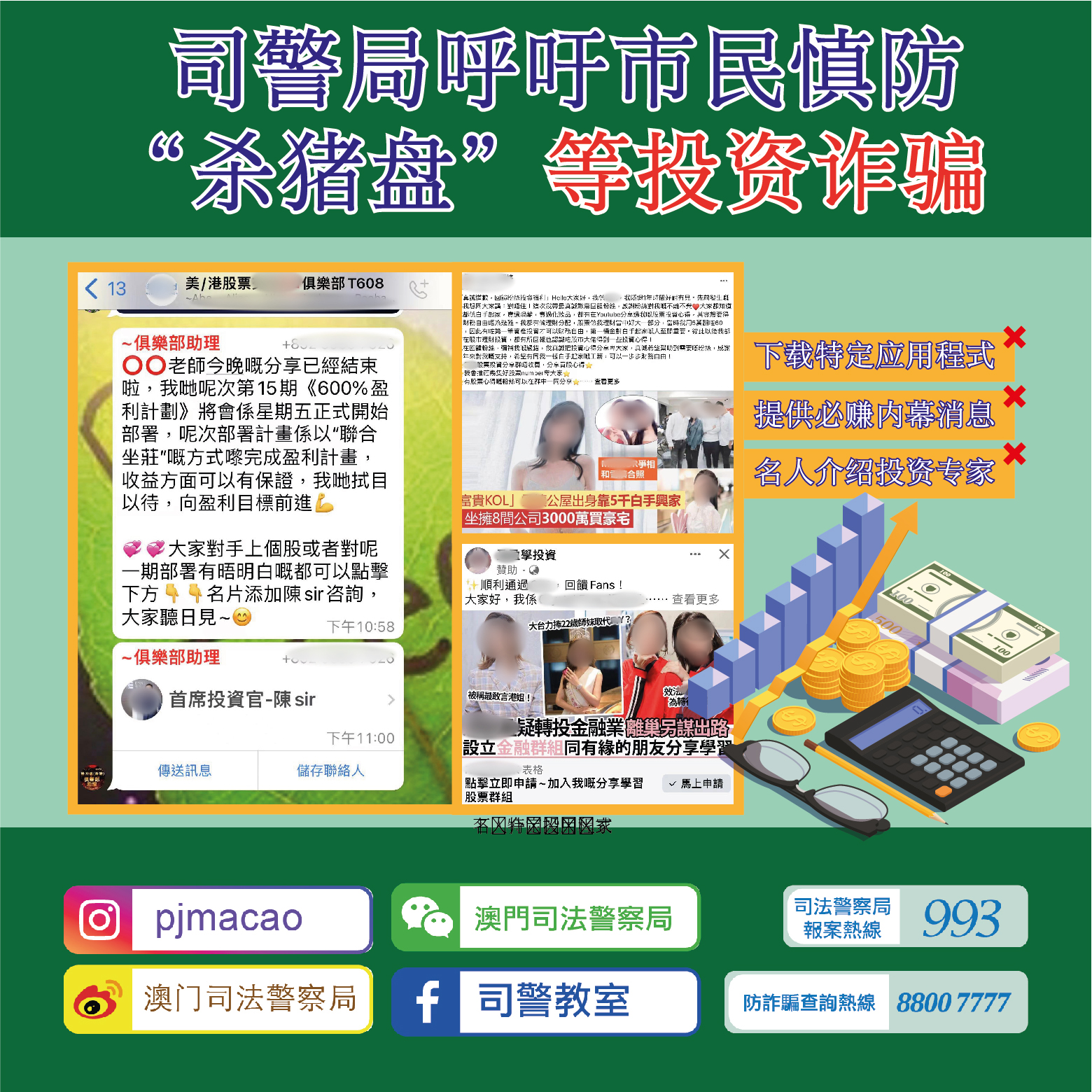 司警局呼籲市民,切勿輕信網上社交平台上所謂名人推介的投資廣告,更不要隨便加入來歴不明的可疑通訊軟件群組,尤其群組內之其他成員身份不詳,極有可能全部由騙徒假扮;同時,要慎防以小額獲利引誘投入大額資金的“殺豬盤”投資騙局,不要盲目跟隨任何聲稱高獲利、穩賺不賠的投資建議,以免因小失大而招致損失。倘懷疑遇到詐騙,請致電司警局防詐騙查詢熱線 88007777 或報案熱線 993 求助。