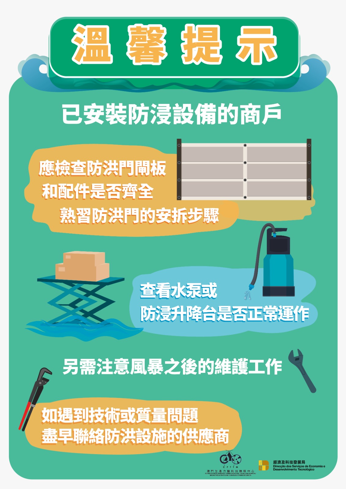 已安裝防浸設備的商戶,應檢查防洪門閘板和配件是否齊全,熟習防洪門的安拆步驟,以及查看水泵或防浸升降台是否正常運作。如有疑問,應盡快向所屬的工程公司或供應商了解,做好準備,以策萬全。