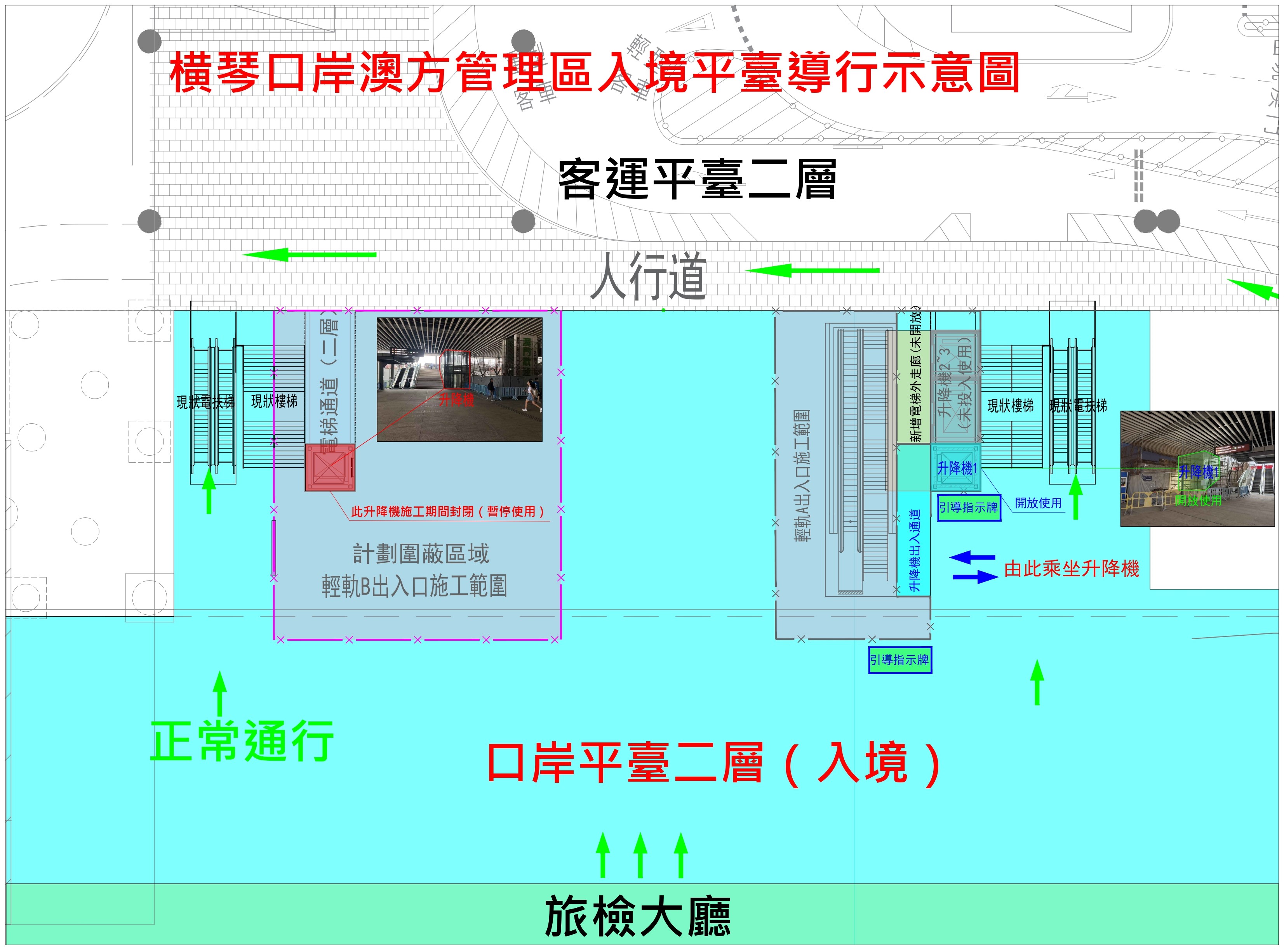 為配合澳門輕軌延伸橫琴線項目橫琴站出入口的施工,橫琴口岸澳方口岸管理區A出入口已改造完成的其中一台升降機將於2023年10月20日起正式啟用,而位於B出入口現正使用的升降機將於同日停止運作(詳見附圖),敬請出入境市民/旅客遵守臨時圍封所設置之導行標誌及諒解是次改動所造成之不便。
