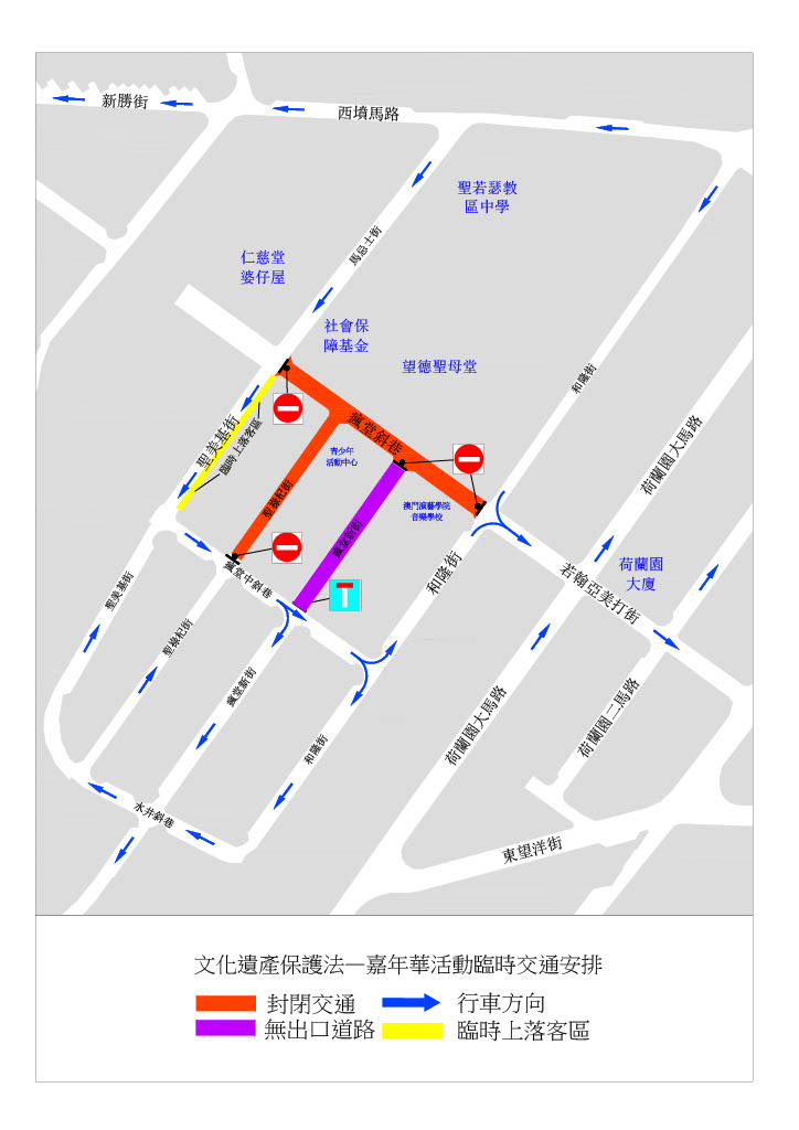 配合文化局舉辦嘉年華活動,瘋堂斜巷一帶道路於10月27日(周五)至29日(周日)實施臨時交通措施,詳情可查閱附表。
