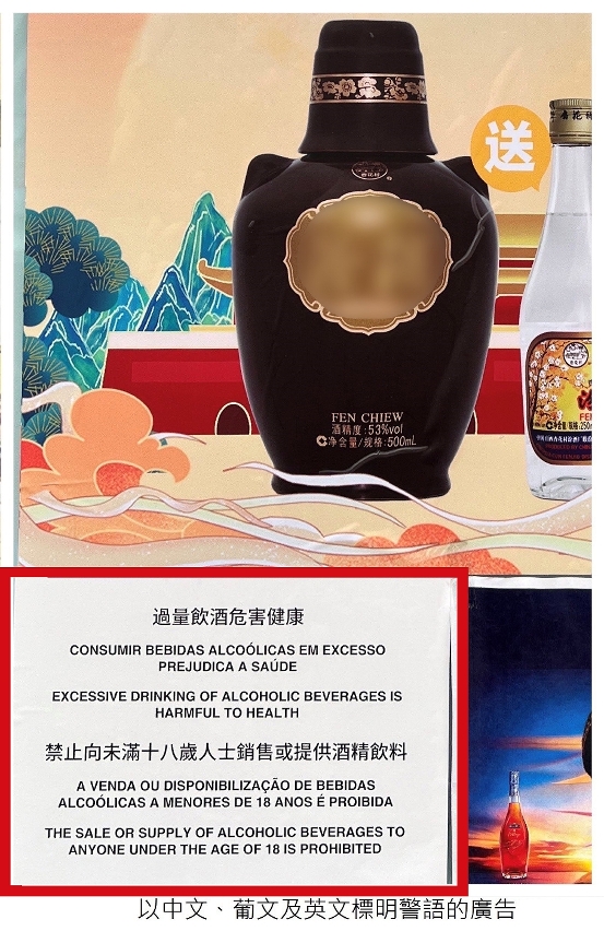第6/2023號法律《預防及控制未成年人飲用酒精飲料制度》(下稱《控酒法》) 將於11月5日起正式生效。《控酒法》規定,銷售或提供酒精飲料的地方,須以顯眼方式張貼經行政長官批示核准禁止向未成年人銷售或提供酒精飲料的標誌。《控酒法》同時規定,屬提供自助服務的商業場所須劃定及清晰標示陳列酒精飲料及非酒精飲料的區域,而酒精飲料的廣告應以中文、葡文及英文標明警語。
