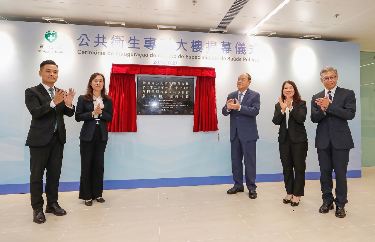 澳門特別行政區行政長官賀一誠今(27)日在社會文化司司長歐陽瑜、司長辦公室主任何鈺珊、衛生局局長羅奕龍和副局長郭昌宇陪同下,主持了衛生局公共衛生專科大樓的揭幕儀式。