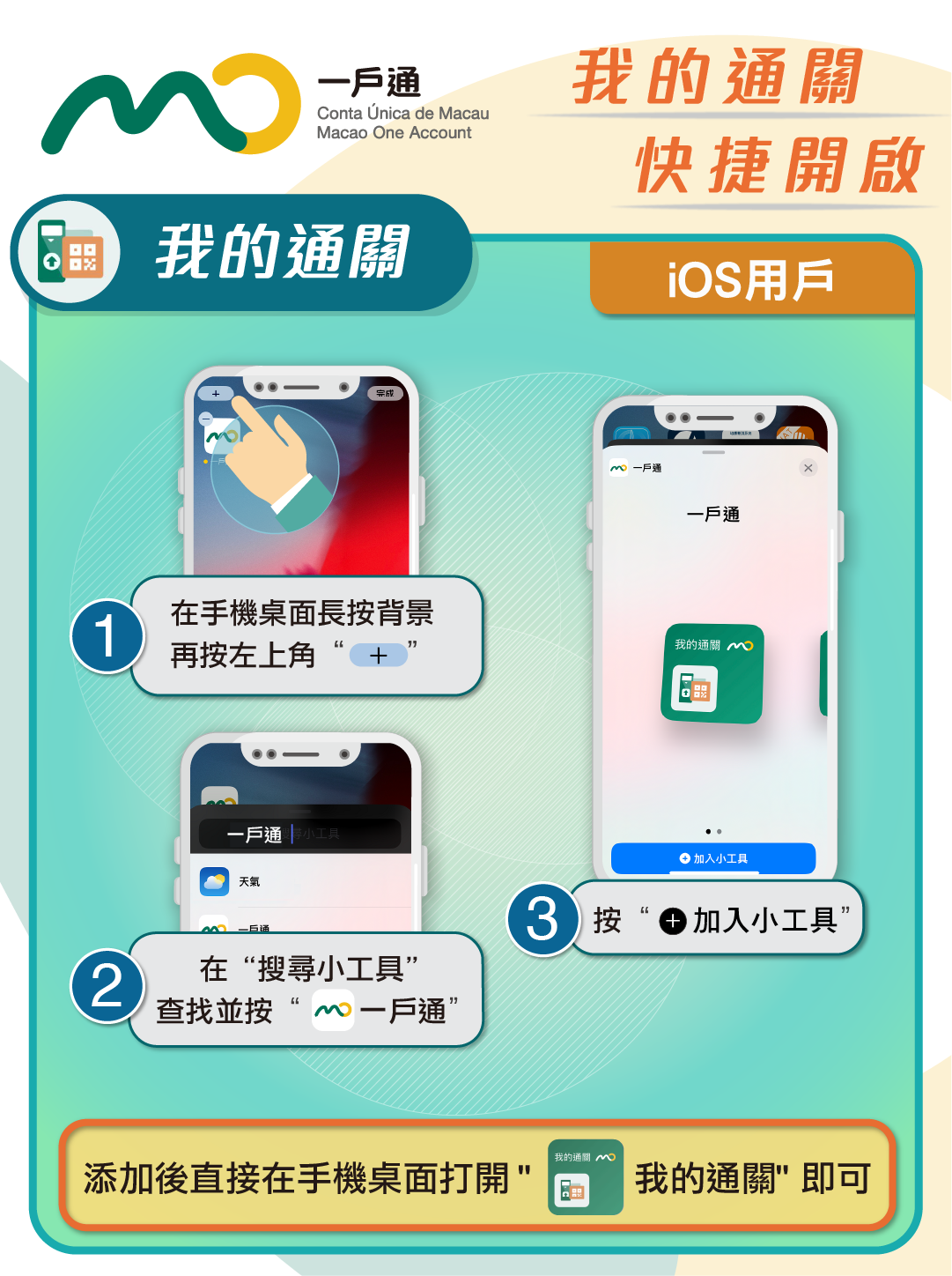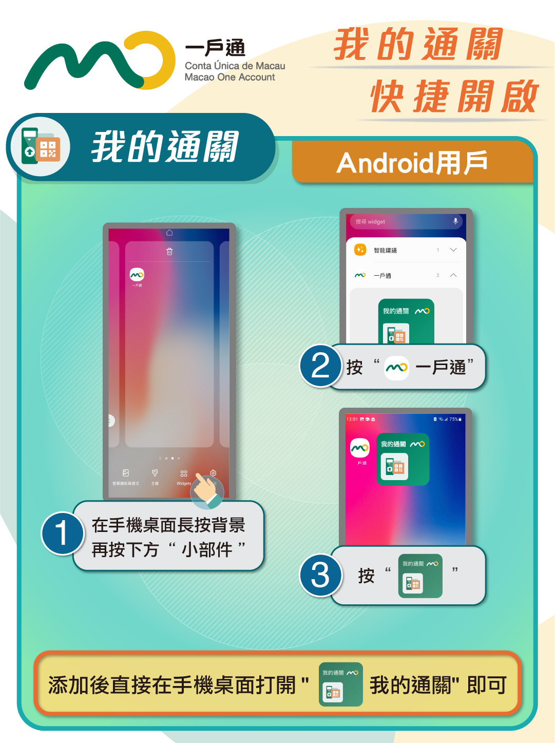 市民更新“一戶通”最新版本後,可按相應手機種類透過添加桌面小工具建立捷徑。添加後,無需開啓“一戶通”手機應用程式,即可通過桌面捷徑直接打開“我的通關”二維碼掃碼過關。