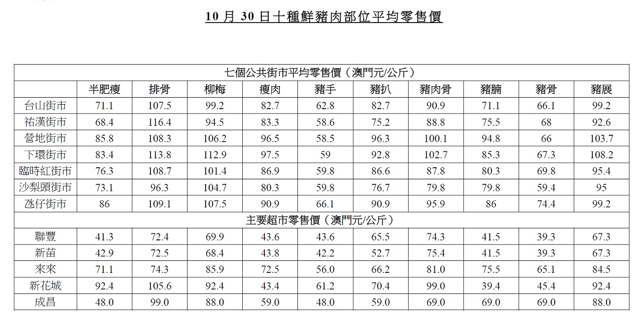 本澳活豬批發價由10月27日起,由每司馬擔(即60.48公斤)澳門元1960元下調至1600元,公共街市的豬肉檔及超市、零售店的鮮豬肉零售價也按相應比例作出調整,市政署由10月28日起,一連七天公布本澳七個公共街市及主要超市的十種鮮豬肉的平均零售價,以提升市場價格的透明度,保障消費者權益。