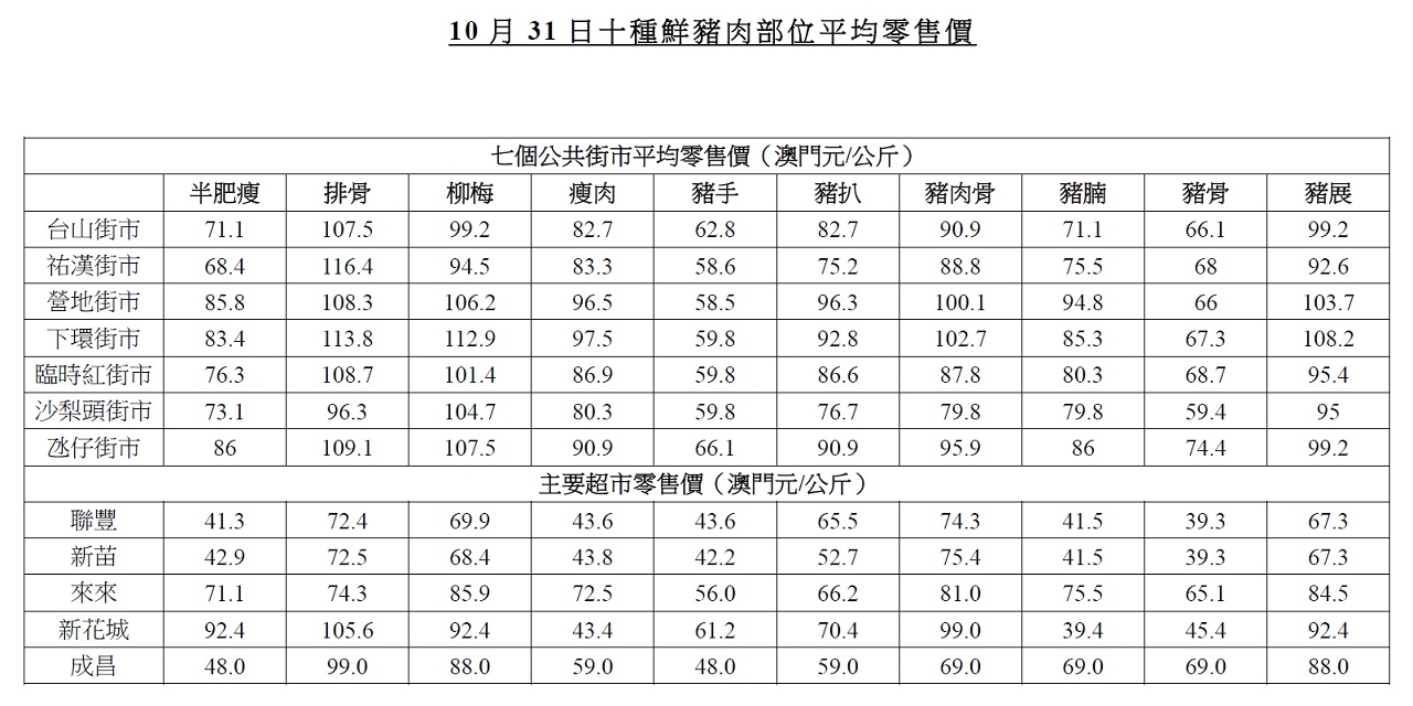 本澳活豬批發價由10月27日起,由每司馬擔(即60.48公斤)澳門元1960元下調至1600元,公共街市的豬肉檔及超市、零售店的鮮豬肉零售價也按相應比例作出調整,市政署由10月28日起,一連七天公布本澳七個公共街市及主要超市的十種鮮豬肉的平均零售價,以提升市場價格的透明度,保障消費者權益。