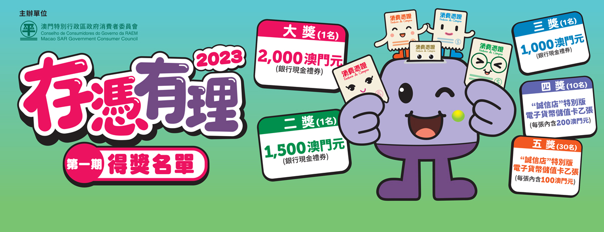 消委會抽出“存憑有理2023”第一期各個獎項共43名的得獎者,得獎者名單已公佈於消委會網頁(https://www.consumer.gov.mo)及消委會辦事處(高士德26 號何鴻燊夫人大廈地下)公佈欄內,得獎者亦將收到消委會電話短訊通知領獎。