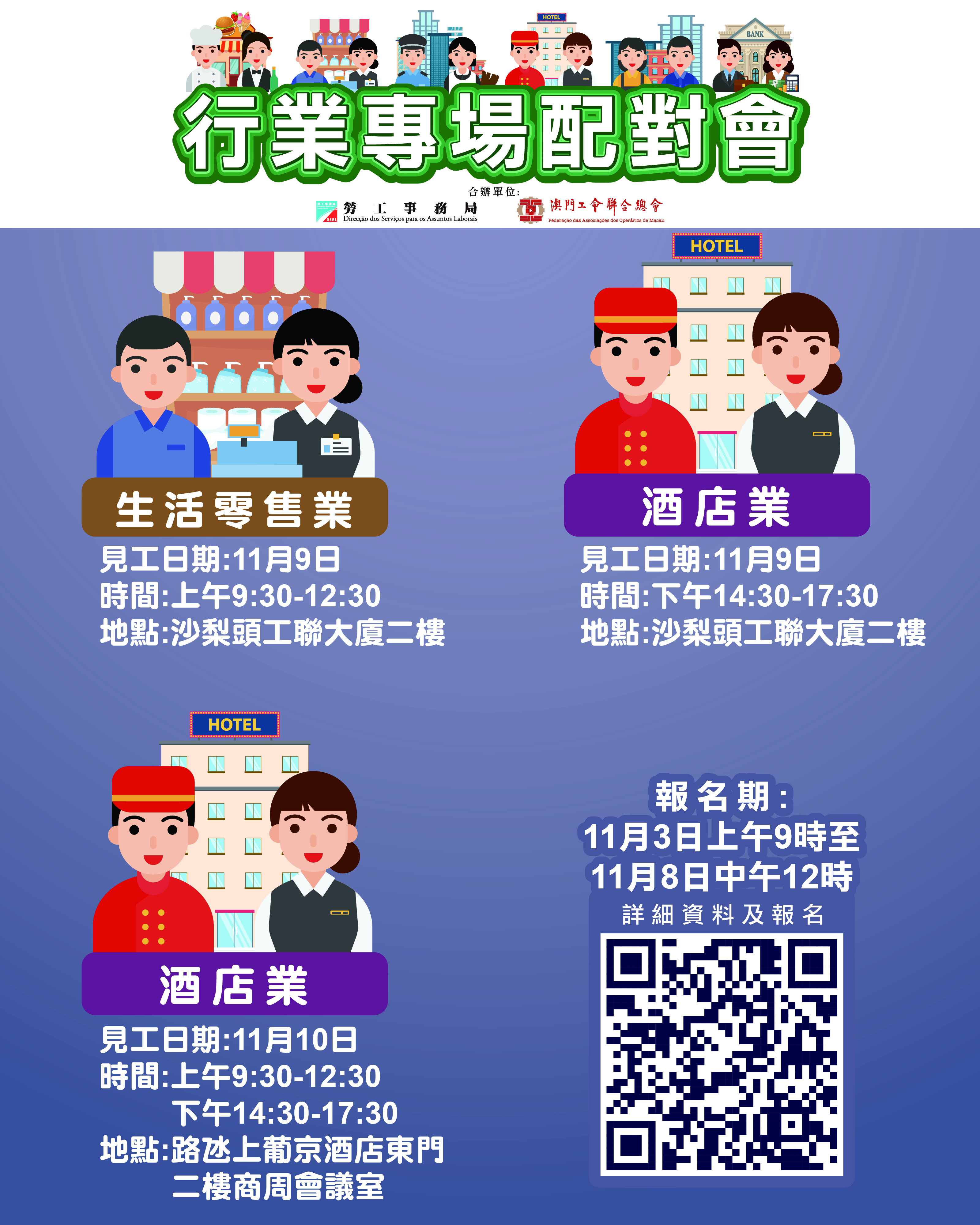 11月9日上午舉辦生活零售業配對會,提供266個職位空缺,涉及分區經理、見習經理、店務副經理、店務組長、醫學美容顧問及店務員等。下午舉辦酒店業配對會,提供57個職位空缺,涉及餐飲部部長、餐飲服務員、房務員、工程部技術員、洗衣房服務員、前台服務員、中餐廚師及廚師助理等。以上配對會在澳門工會聯合總會二樓(沙梨頭海邊街2-6號工聯大廈)舉行。