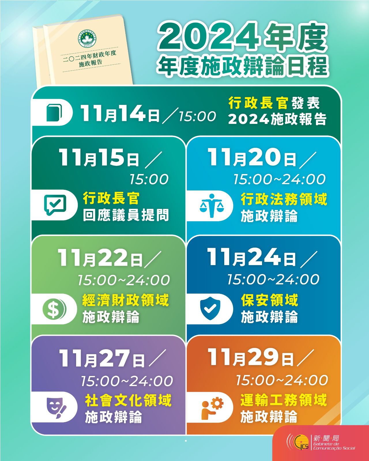 至於各領域施政方針的立法會辯論會議,日程分別是:11月 20日辯論行政法務領域、22日辯論經濟財政領域、24日辯論保安領域、27日辯論社會文化領域,以及29日辯論運輸工務領域施政方針。