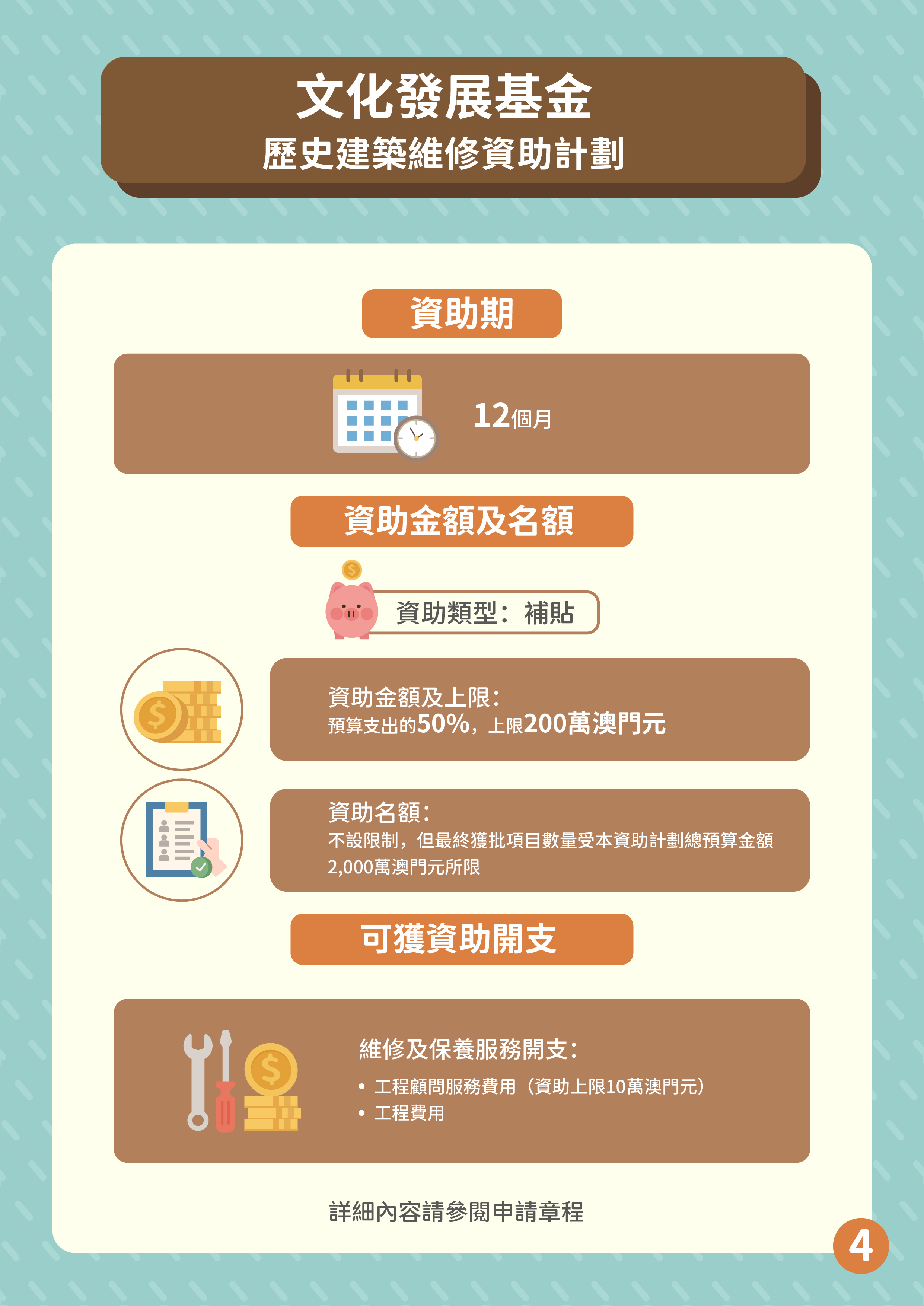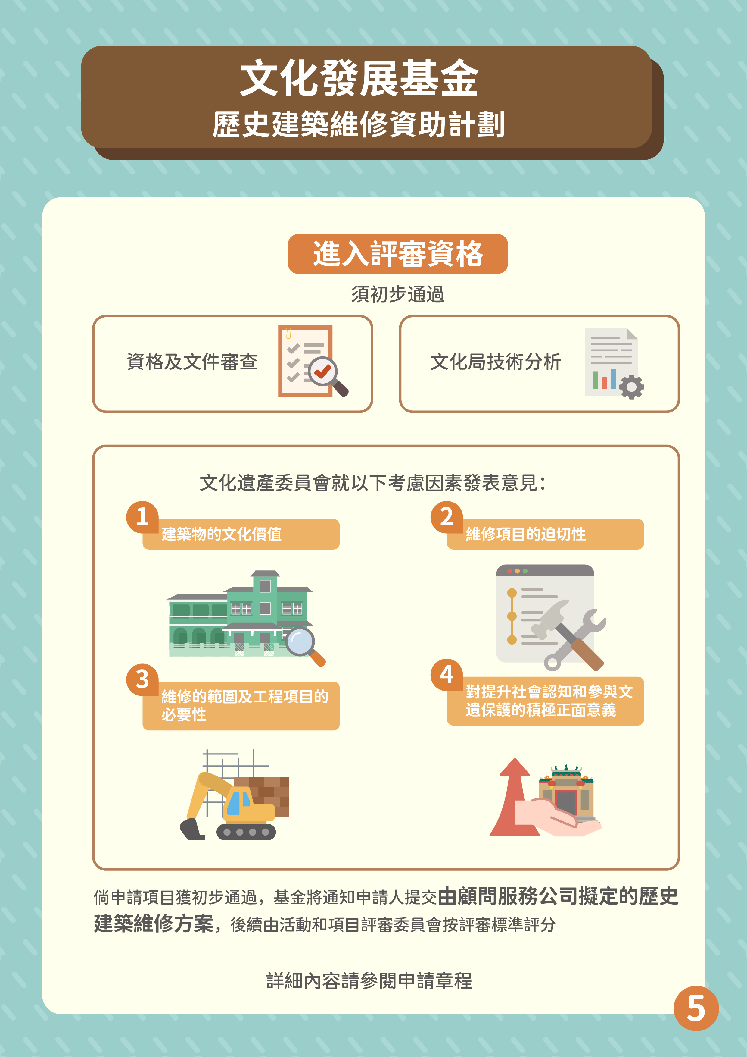 資助計劃支持業權人定期對私人文物建築和具文化價值建築開展結構檢查或檢測、實施外觀保養,以及因應檢測結果實施必要的修復及維護等工作。文化發展基金將對申請項目作資格及文件審查,並送交文化局進行技術分析,接着會交由文化遺產委員會就該申請建築物的文化價值、維修的迫切性和必要性,以及對提升社會認知和文遺保護的正面意義等因素發表意見。倘申請項目獲初步通過,基金將通知申請人提交由顧問服務公司擬定的歷史建築維修方案,後續由基金的活動和項目評審委員會就申請項目的維修工程必要性、建築物狀態的預期改善效果、預算合理性作出評分。倘申請項目具有維修後對公眾開放方案或活化方案,可額外加分。