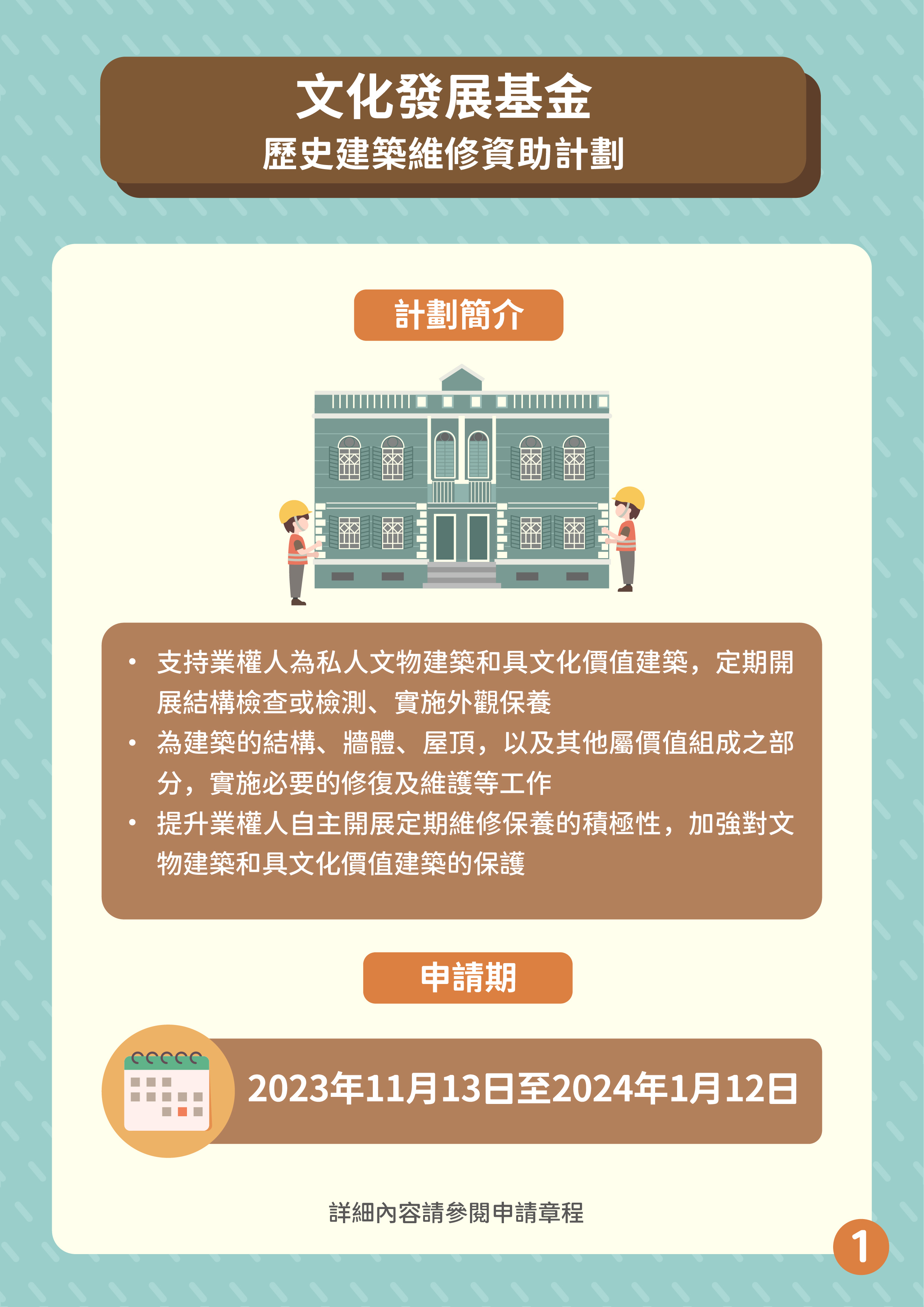 “歷史建築維修資助計劃”申請期由2023年11月13日至2024年1月12日。資助範圍包括在申請期開始前尚未開展維修工程的被評定、待評定的不動產及具文化價值的不動產,並須由不動產的業權人或合法代理人提交申請;在不動產無法釐清業權或被認定為業權人無法聯繫的情況下,才可由佔有人或持有人提交申請。
