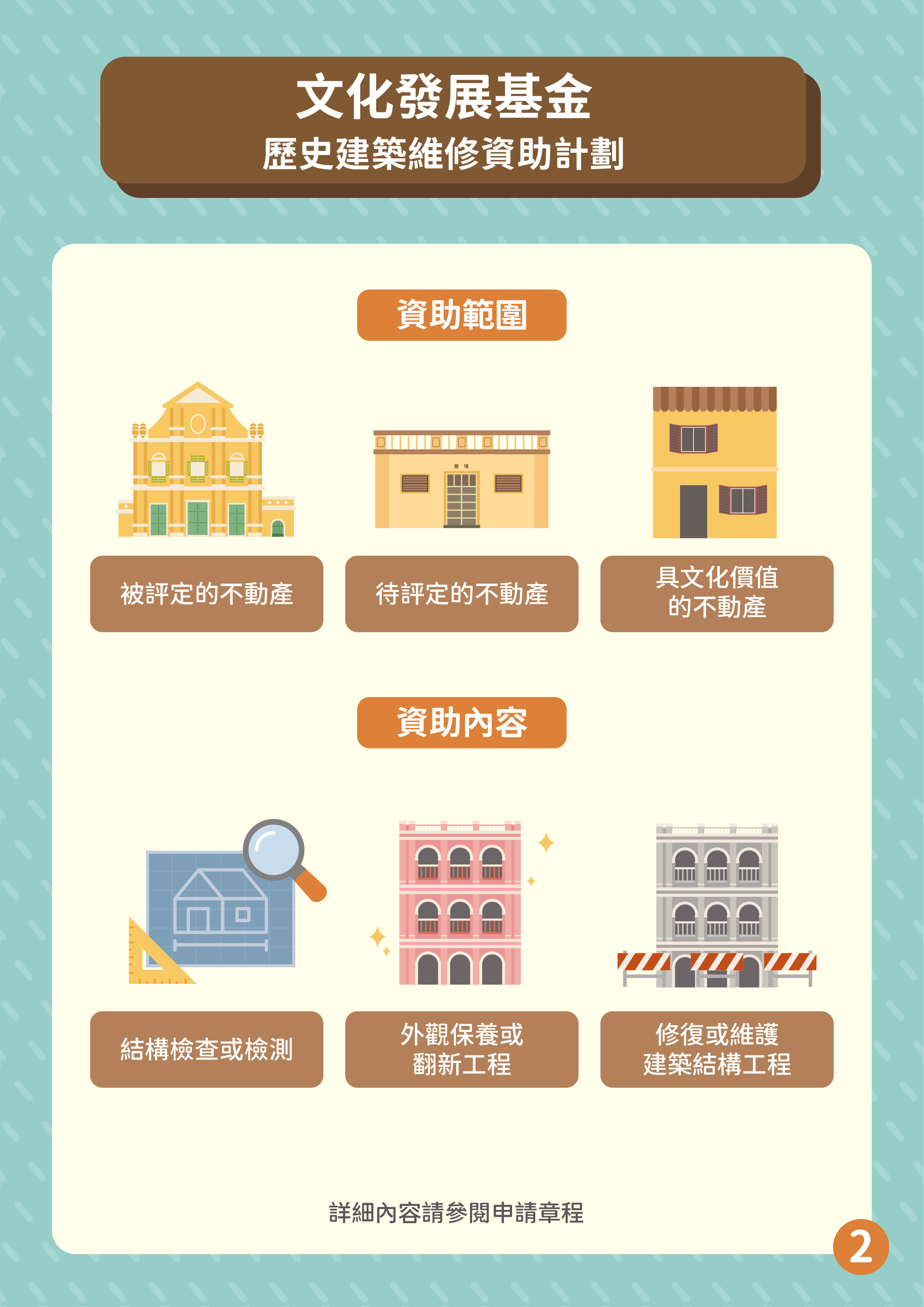 文化發展基金為加強推動歷史建築的保護和活化,推出“歷史建築維修資助計劃”,透過資助提升業權人自主開展定期維修保養的積極性,加強對文物建築和具文化價值建築的保護。