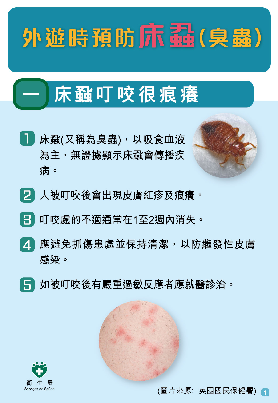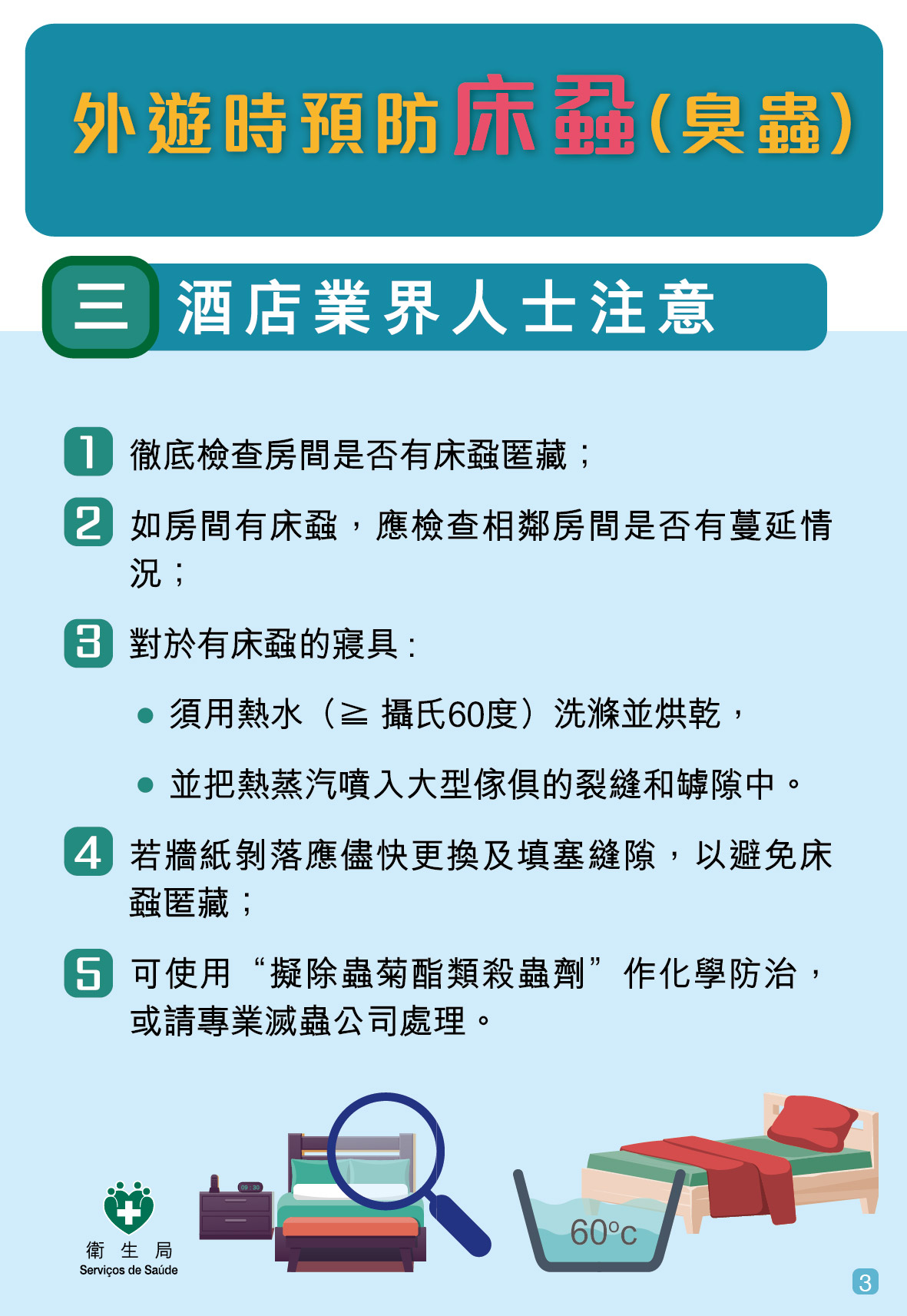 此外,衛生局已制定及發佈防範臭蟲的指引,包括給公眾、旅遊業、酒店業及同類場所,以及給航空業界的建議,供居民及業界參閱。該指引可於此路徑下載 : 衛生局傳染病資訊網頁https://www.ssm.gov.mo/csr ->旅遊衛生->旅遊健康小錦囊->防範臭蟲(床蝨)資訊。