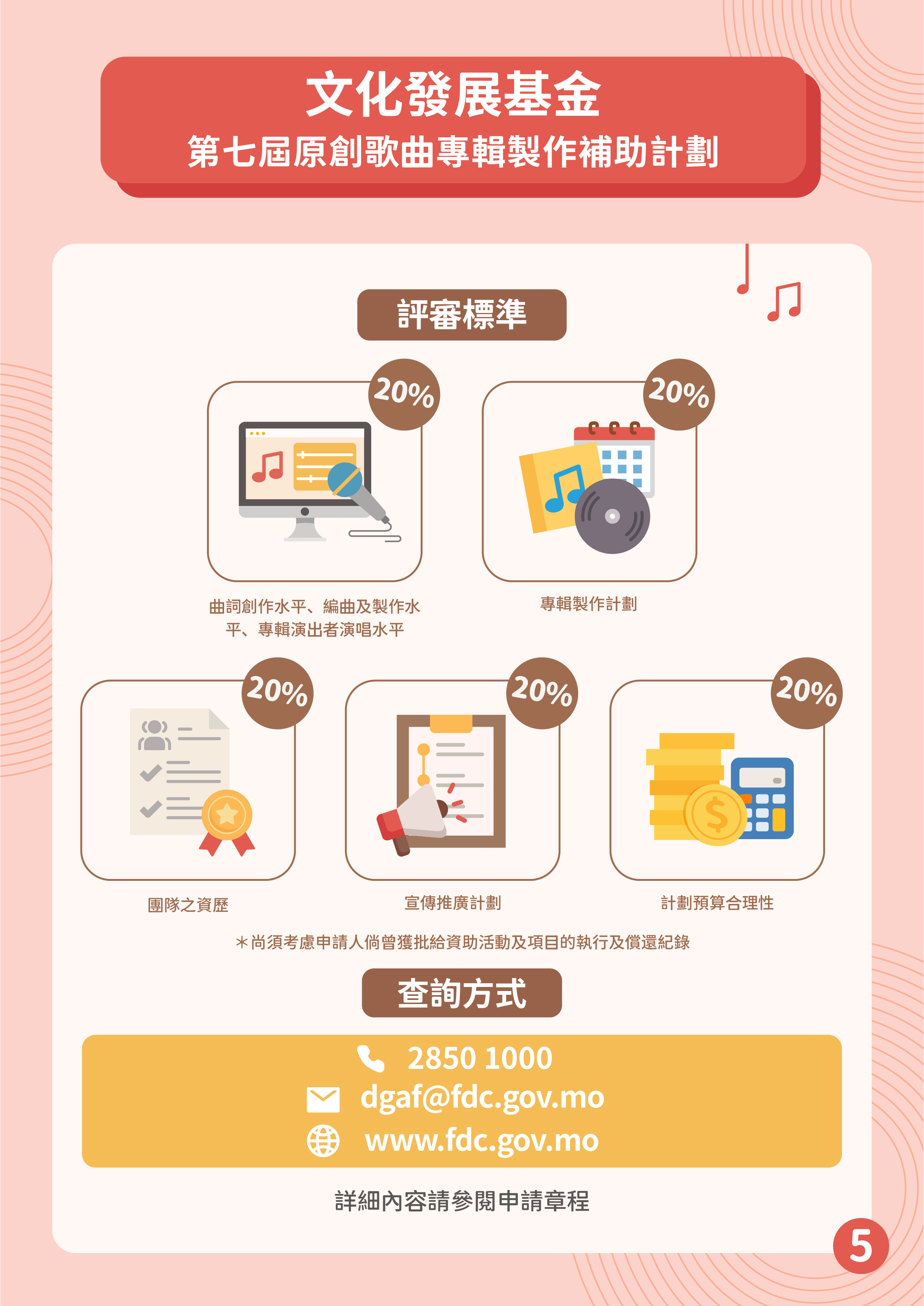 為詳細介紹“第七屆原創歌曲專輯製作補助計劃”的申請事宜及解答申請人問題,基金將於11月21日下午3時假誠豐商業中心7樓演講廳(地址:澳門宋玉生廣場322-362號)舉行專場講解會,有興趣人士請於基金網站(www.fdc.gov.mo)報名,查詢請致電8985 0862或電郵karenchoi@fdc.gov.mo。
