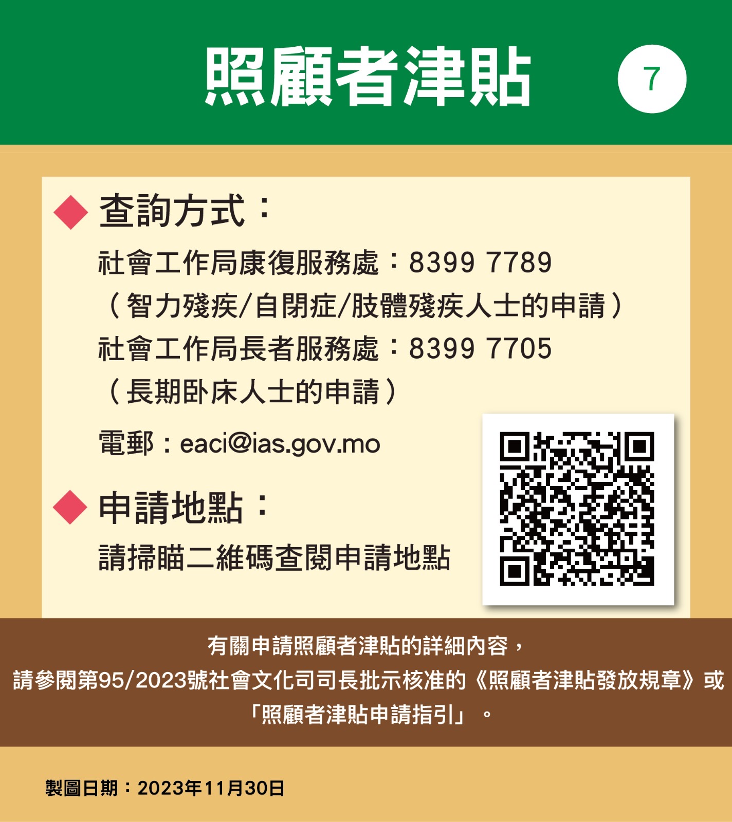 第95/2023號社會文化司司長批示核准的《照顧者津貼發放規章》(下稱規章)於12月1日開始生效,照顧者津貼正式轉為恆常性措施。規章訂定了有關津貼的發放制度與相關安排,社會工作局將按照規章的規範內容,跟進有關申請、審批、發放、監察和覆查等工作。