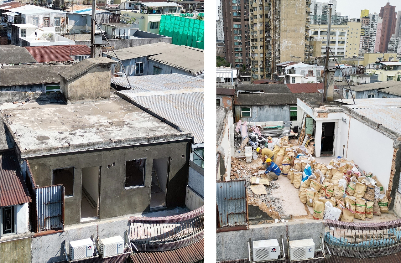 該僭建物位於美的路主教街一大廈天台,土地工務局接獲投訴並查證屬實後展開聽證,要求違法人自行清拆僭建物及將受影響的樓宇共同部分回復原狀。期間,違法人曾申請自願拆卸僭建物,惟有關期限屆滿後,僭建物不但至今未被完全拆除,更重新開展非法工程,正翻新該混凝土頂蓋、磚塊牆、玻璃窗戶及金屬花架所組成的兩層天台僭建物,故拆遷組採取行動清拆。