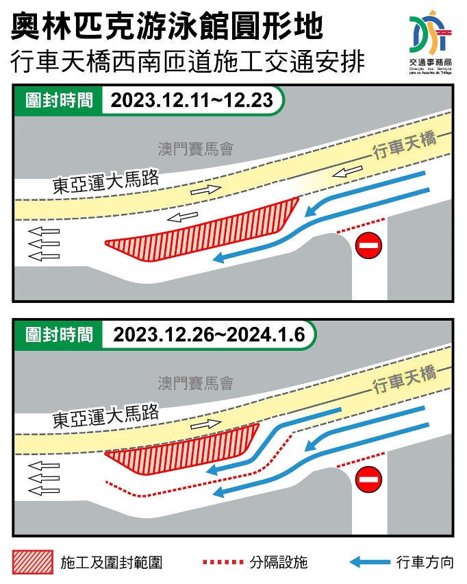 題述西南匝道行車天橋已於早前完成結構施工及全橋貫通,故此位於東亞運大馬路的臨時鋼平台將於2023年12月11日至2024年1月6日分階段進行拆卸工作,而2024年1月7日至2024年1月31日則進行道路重整工作,上述期間,東亞運大馬路往西灣大橋方向的部份路段分段實施有限度通車(詳見附圖);而奧林匹克游泳館圓形地的臨時交通措施和巴士臨時調整繼續維持現有安排,直至鋼平台拆卸工作完成後將恢復原有安排。