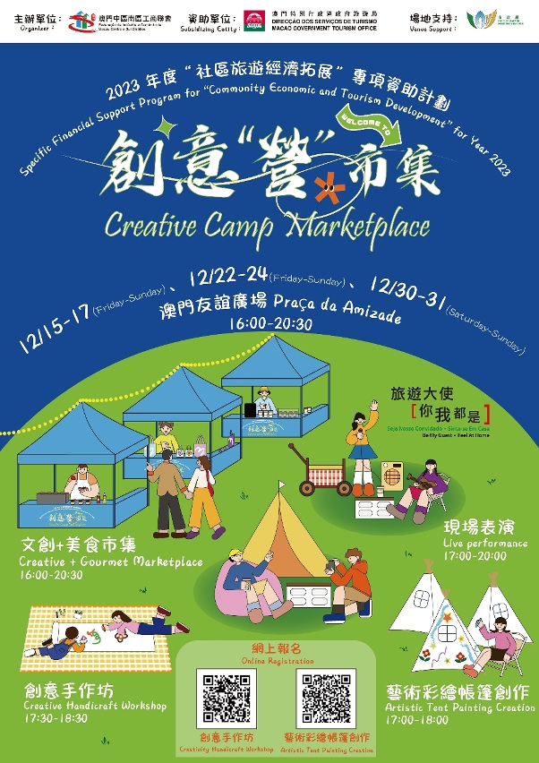 以露營風格為主題的“創意‘營’市集”將於12月15至17、22至24和30至31下午4時至晚上8時30分,在澳門友誼廣場舉行。現場除了文創和美食市集及表演活動外,更設有不同的創意手作坊及藝術繪畫體驗供居民及旅客參與。