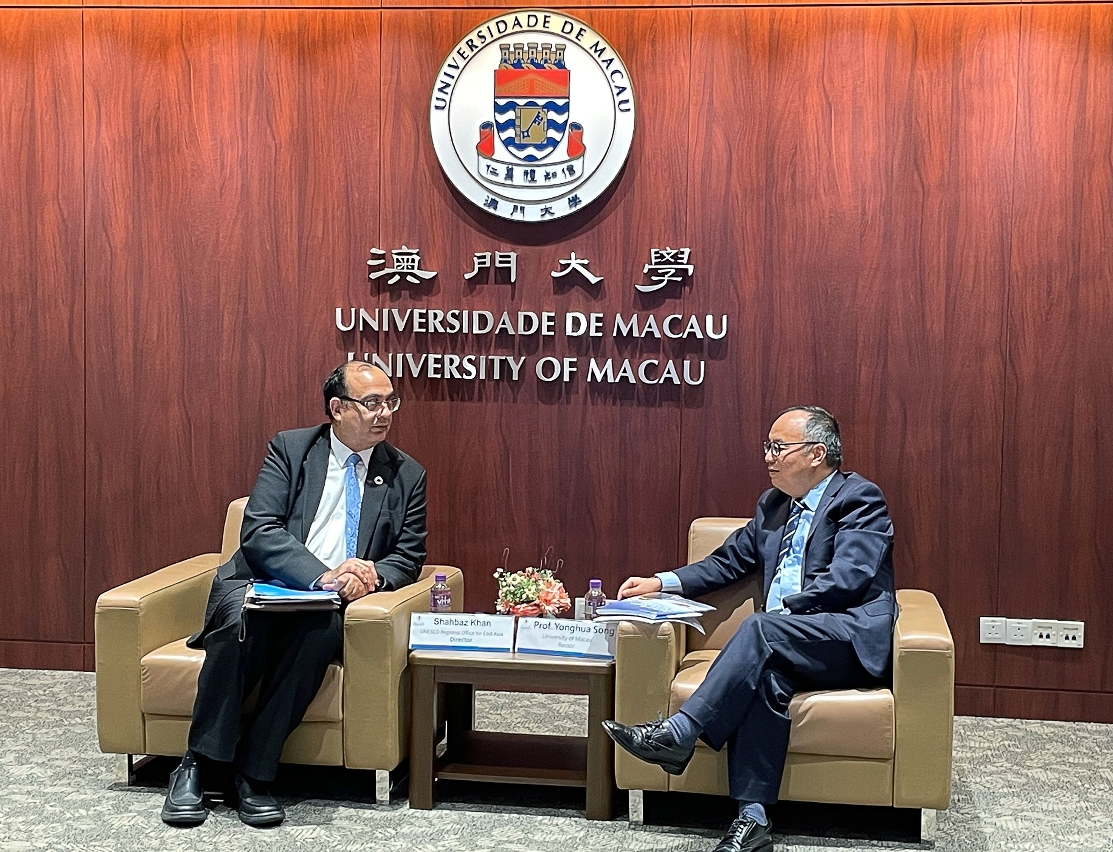 聯合國教科文組織駐華代表處代表夏澤翰(Shahbaz Khan)今(12)日率代表團訪問澳門大學,獲澳大校長宋永華熱情接待並進行座談交流。夏澤翰亦以“聯合國教科文組織在可持續發展中的作用”為題在澳大進行演講。