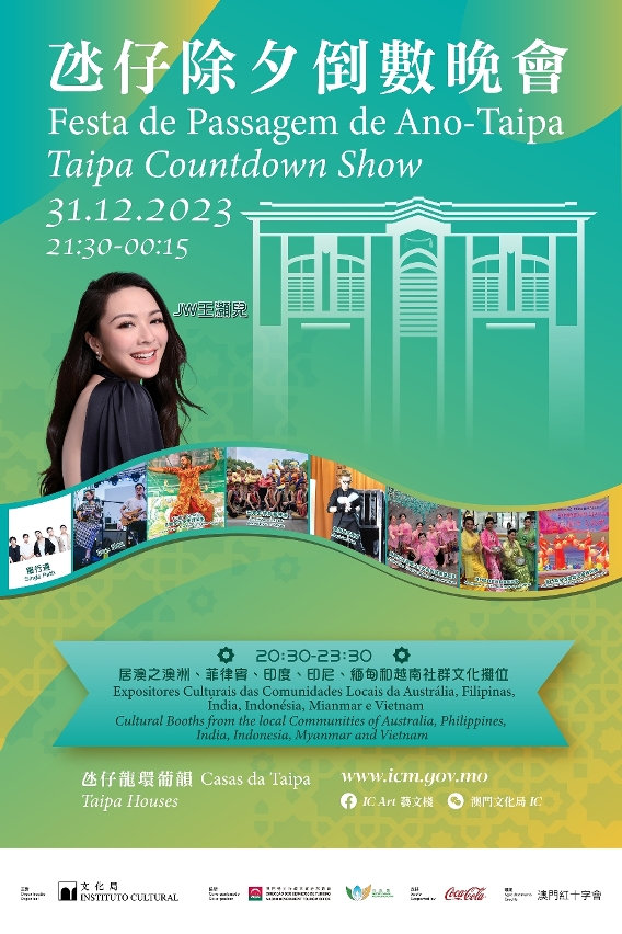“氹仔除夕倒數晚會”將在龍環葡韻舉行,以多元文化共融為晚會主軸。舞台演出於晚上9 時30分開始,邀請香港女歌手JW王灝兒作為壓軸演出嘉賓,送上多首膾炙人口的代表作;而一系列各具文化特色的本地單位演出,分別有本地樂隊單行道及Iron Son、Victor Kumar及寶萊塢夢想舞蹈團、居澳菲律賓藝術團Associação Bisdak de Macau、魔術師孫振新、澳門印尼歸僑文化藝術聯誼會舞蹈團、澳門緬甸友好協會舞蹈團及澳門越南同鄉聯誼會舞蹈團。此外,晚會現場於晚上8時30分至11時30分,設有居澳之澳洲、菲律賓、印度、印尼、緬甸及越南社群文化攤位,展示當地傳統服飾、旅遊資訊、地道小食及飲品,彰顯本澳多元文化、民族共融、和諧共處的生活模式。
