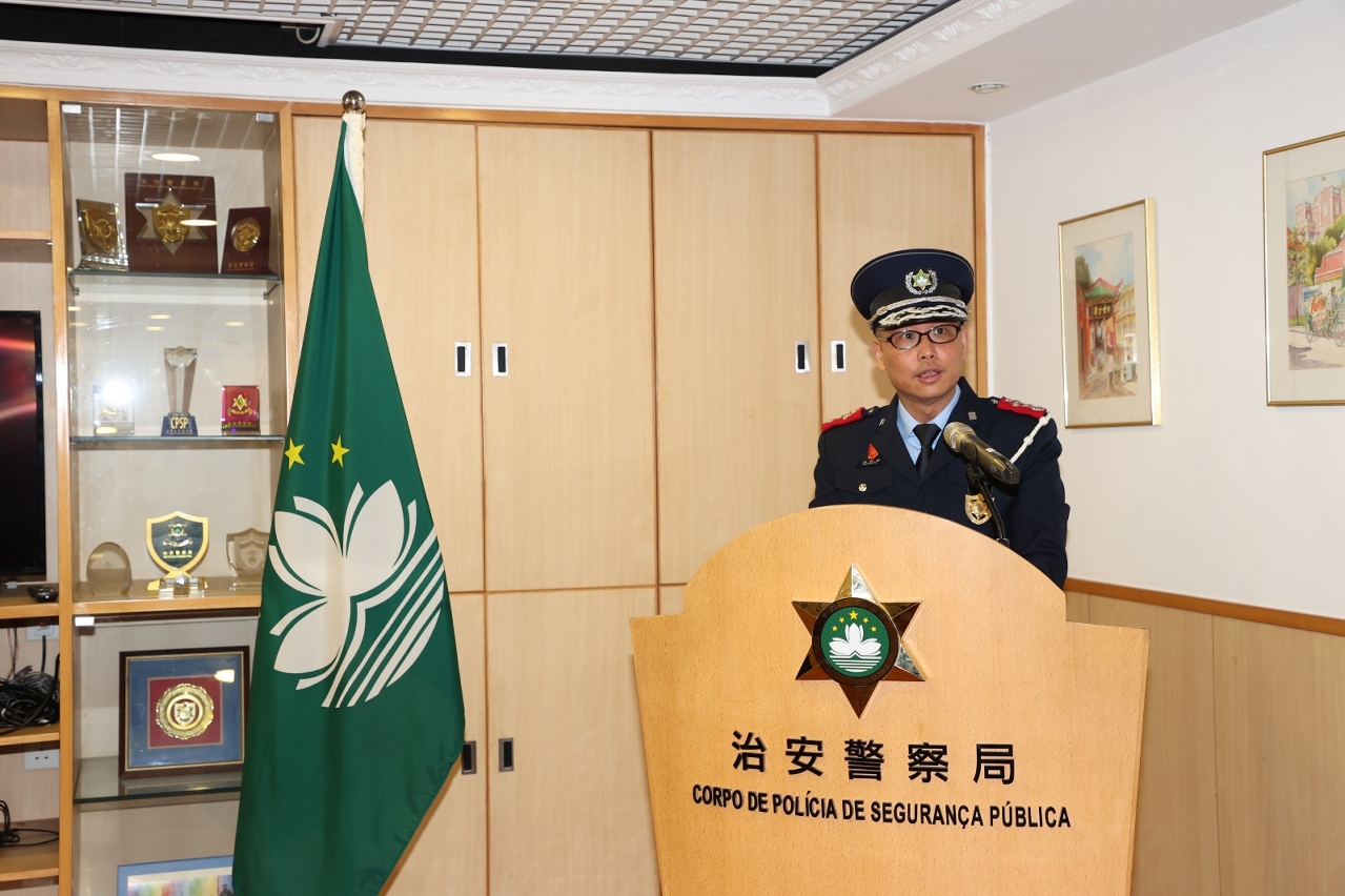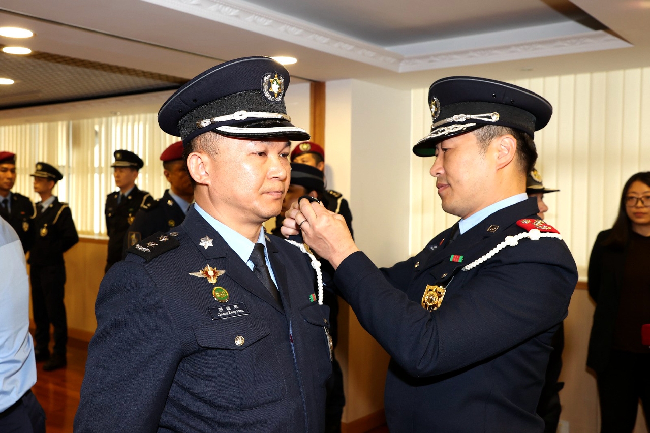 治安警察局於今(15)日在總部舉行高級警長晉升儀式,儀式由吳錦華局長主持,黃偉鴻副局長、梁慶康副局長、伍素萍副局長及各部門主管亦出席儀式,為晉升同僚致賀。