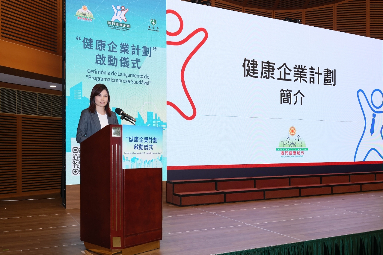 衛生局健康促進處黃穎雯處長於啟動儀式上向出席者介紹了計劃的宗旨和內容。她指出,目前本澳總勞動人口約為38萬人,佔總人口的一半以上,人均每日約有三分一時間處於工作場所。推出“健康企業計劃”的核心目標是為員工創造一個健康、積極、高效的工作環境。優化工作場所的政策和環境對提升勞動人口的健康至關重要。