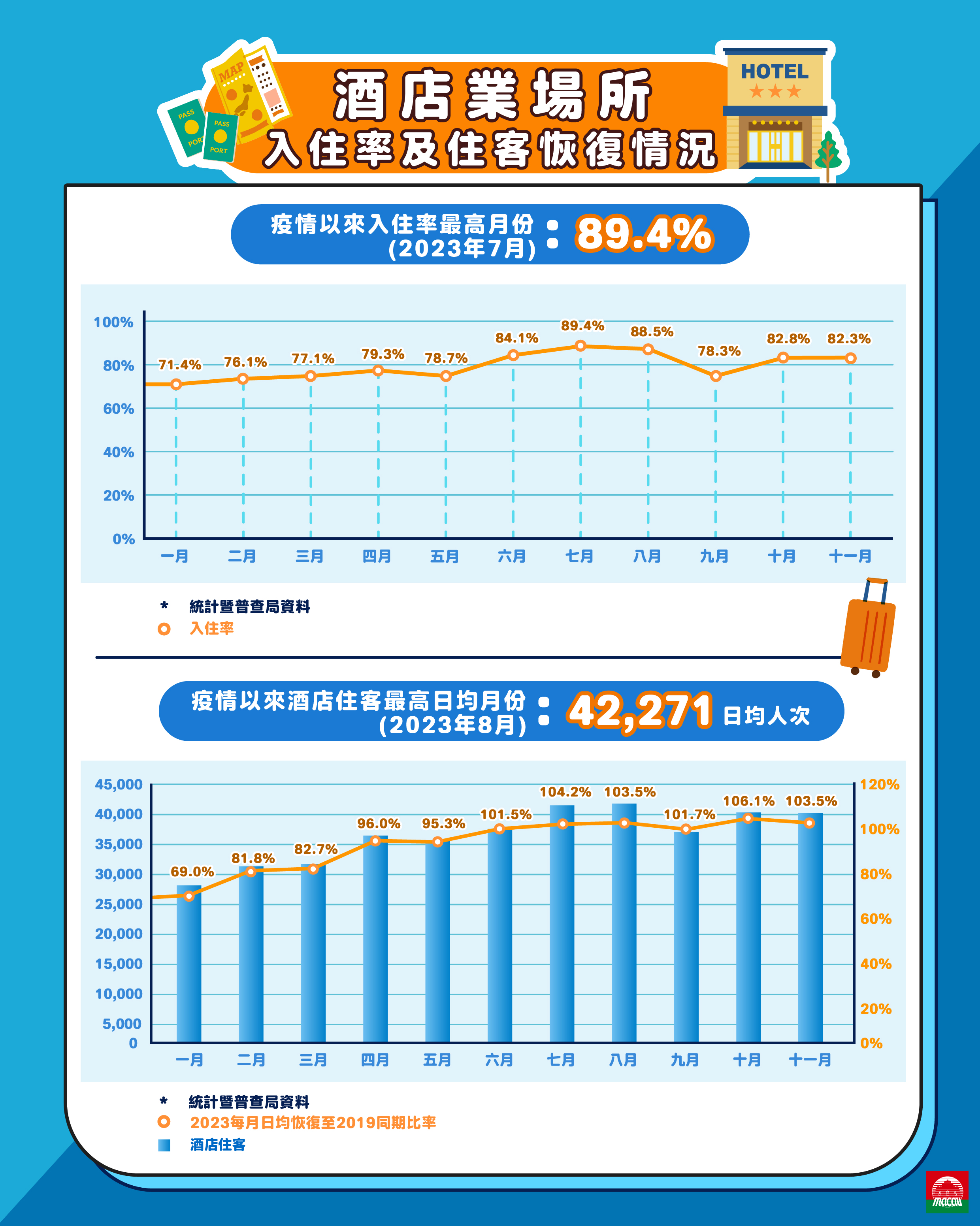 自2023年澳門全面恢復通關,入境旅客持續攀升,旅遊復甦理想並繼續向好,反映澳門作為“世界旅遊休閒中心”的吸引力,旅客遊澳信心充足。2024年,在穩定旅客入境人次基礎上,旅遊局繼續優化旅遊產品及服務,尤其積極開拓國際客源市場,豐富旅客結構。配合“1+4”經濟適度多元發展策略,致力促進綜合旅遊休閒業,推動“旅遊+”聯動效應。