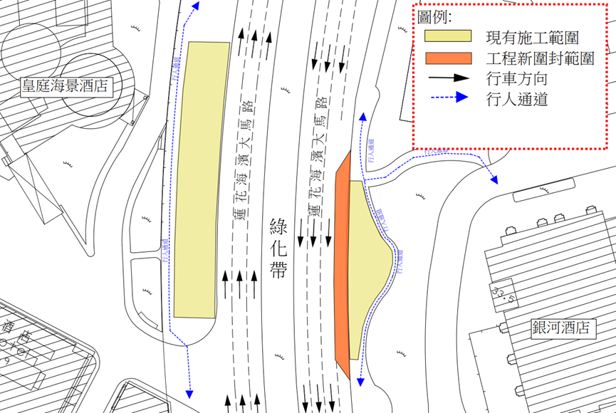 配合氹仔蓮花海濱大馬路行人天橋工程進行,蓮花海濱大馬路往路環方向近銀河酒店西門對出最左側一段車道將於2024年1月8日至10月31日臨時封閉(詳見附圖),以進行行人天橋的施工,其它車道維持不變,請駕駛者留意現場交通指示。