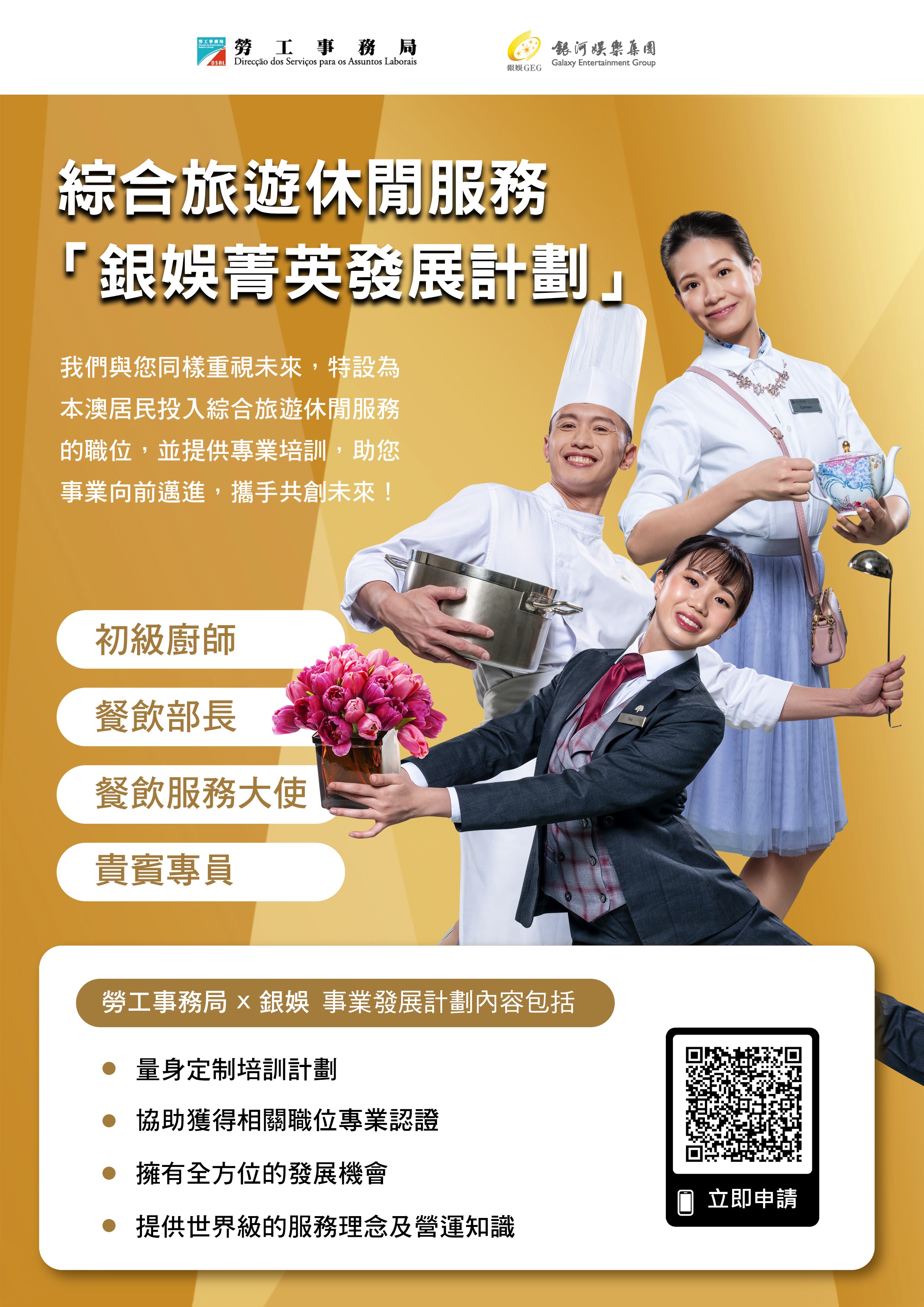 勞工事務局與銀河娛樂集團(下稱“銀河娛樂")合作推出“銀娛菁英發展計劃"(下稱“計劃”),以“先入職、後培訓"方式,為有志投身綜合旅遊休閒服務行業的澳門居民提供全方位培訓及事業發展機會。透過計劃招聘4個職位,合共提供50個空缺,藉此協助有意投身相關行業的澳門居民發展職涯和推動向上流動。計劃由1月9日起接受申請。