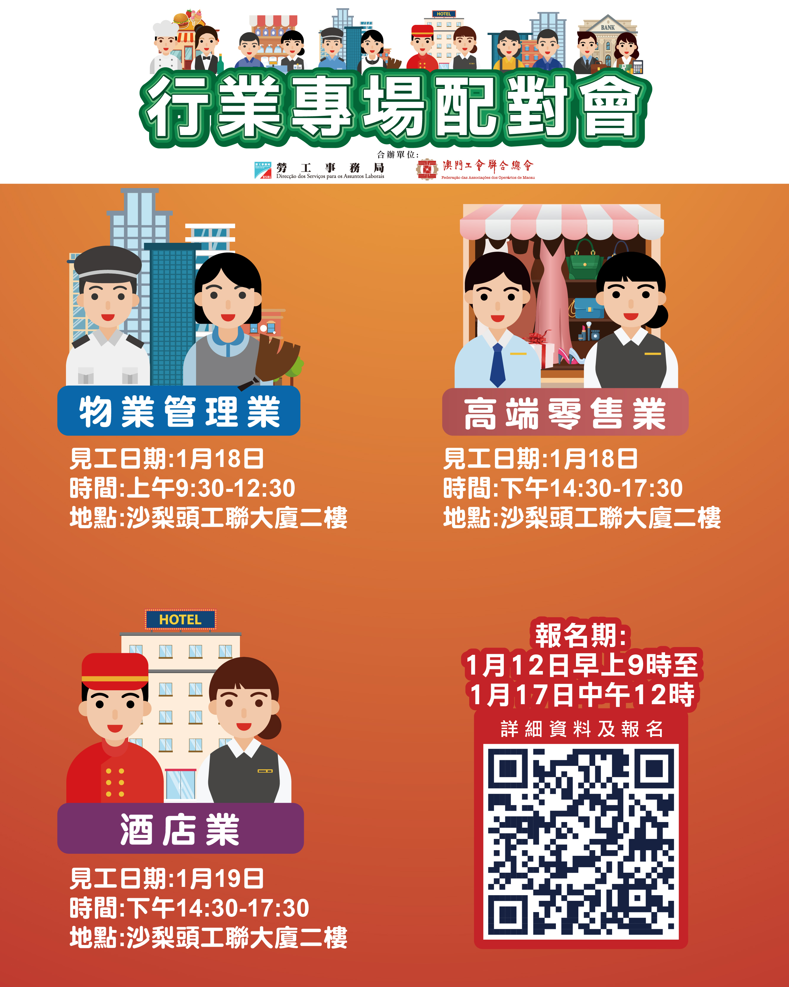 1月19日下午舉辦酒店業配對會,提供135個職位空缺,涉及前台值班經理、會計部經理、資訊科技部經理、人力資源部主任、樓層主任、保安主任、審計員、文員、電腦技術員、歷史導賞員、工程技工、前台服務員、餐飲服務、房務員及保安員等。