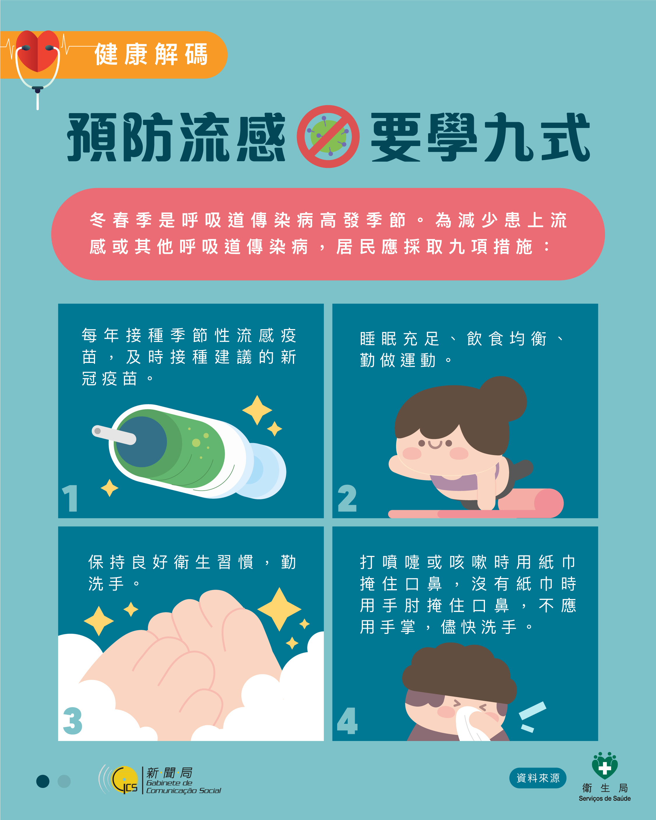 本澳目前已接種16萬1千多劑2023至2024年度流感疫苗,其中院舍的流感疫苗接種率超過九成,幼稚園和小學的接種率接近八成,3歲以下兒童和65歲以上人士的接種率接近五成。比較去年同期數據,本年度各類高危人士的接種率較去年同期均有所提高。此外,衛生局亦已向12歲或以上人士提供XBB單價mRNA新冠疫苗,該疫苗對目前全球各地及本澳主要流行的新冠病毒變異株有較好保護效果,有效預防重症和死亡,並再次呼籲尚未接種的高風險人群,包括孕婦、長者、慢性病患者儘快接種當季的流感疫苗和建議的新冠疫苗;為減少患上流感和其他上呼吸道傳染性疾病,呼籲居民採取以下個人措施進行預防:
