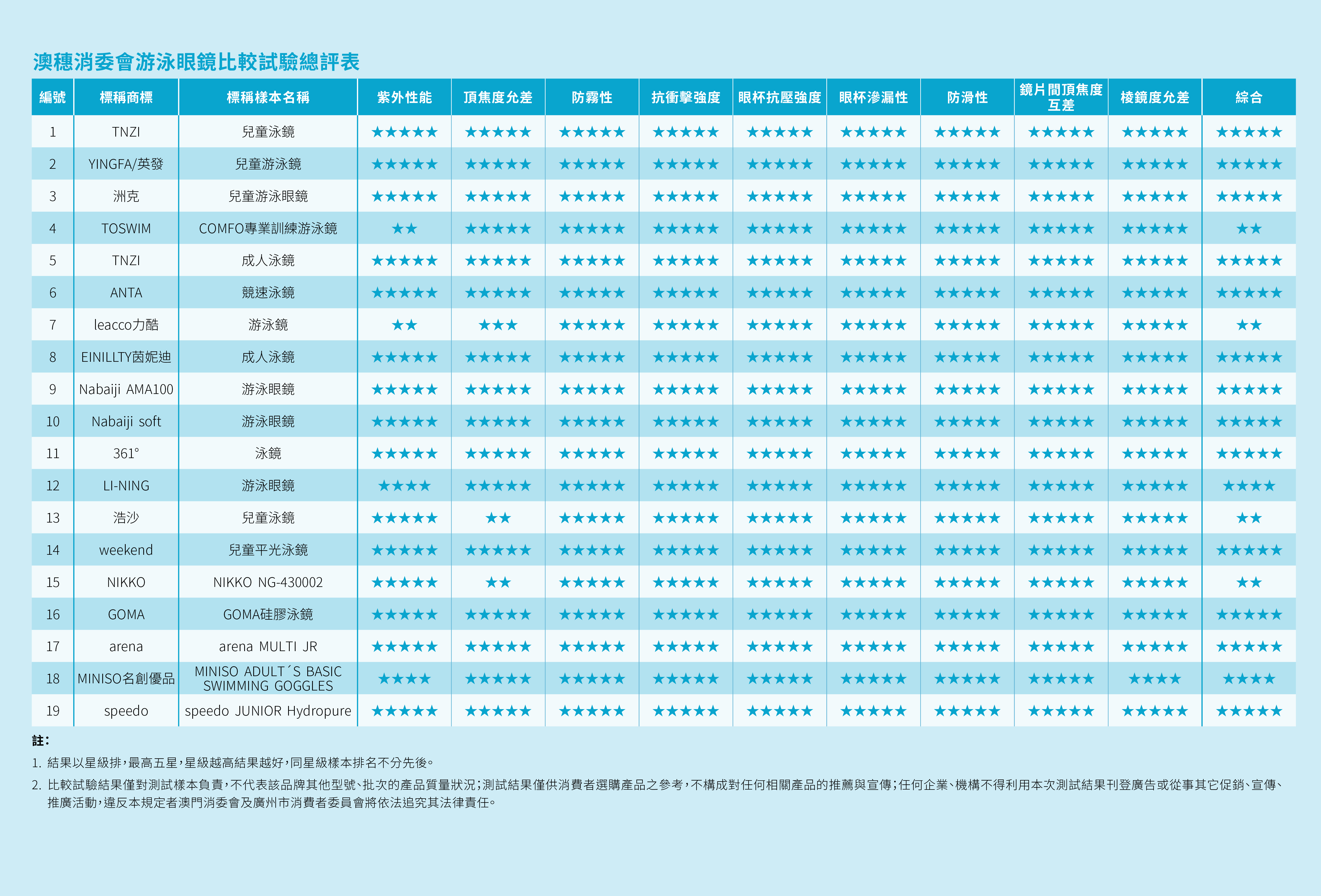 游泳眼鏡是不少消費者游泳運動必備品,為向消費者提供科學的選購資訊,澳穗消委會開展游泳眼鏡的比較試驗,兩會分別在兩地的實體店及線上商店購入19款游泳眼鏡樣本進行測試,其中5款購自澳門實體店。