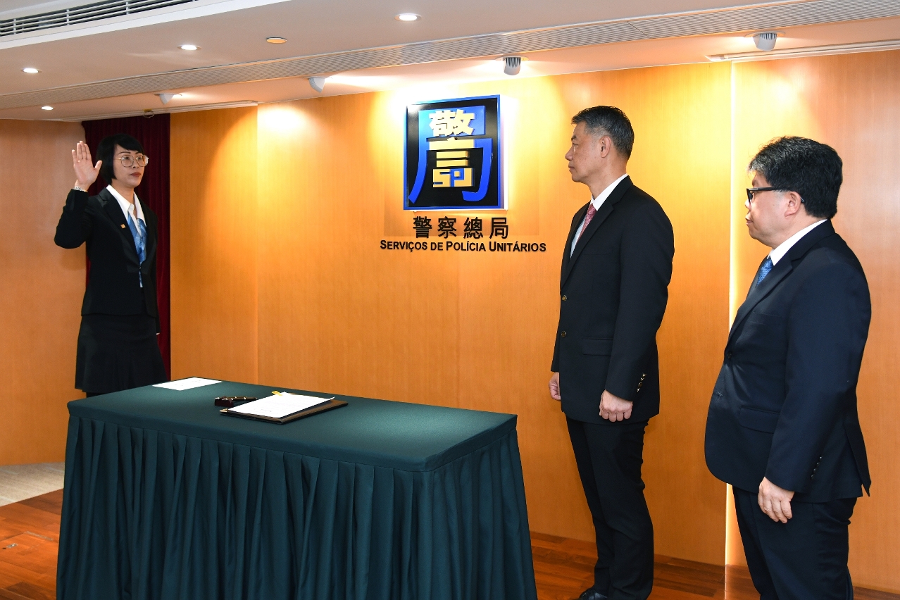 今(1日)警察總局舉行金融情報辦公室主任及副主任就職儀式,由警察總局梁文昌局長主持及監誓,並在三位局長助理、局長辦公室協調員及各部門主管見證下,金融情報辦公室朱婉儀主任及馮婉琪副主任正式宣誓就任。